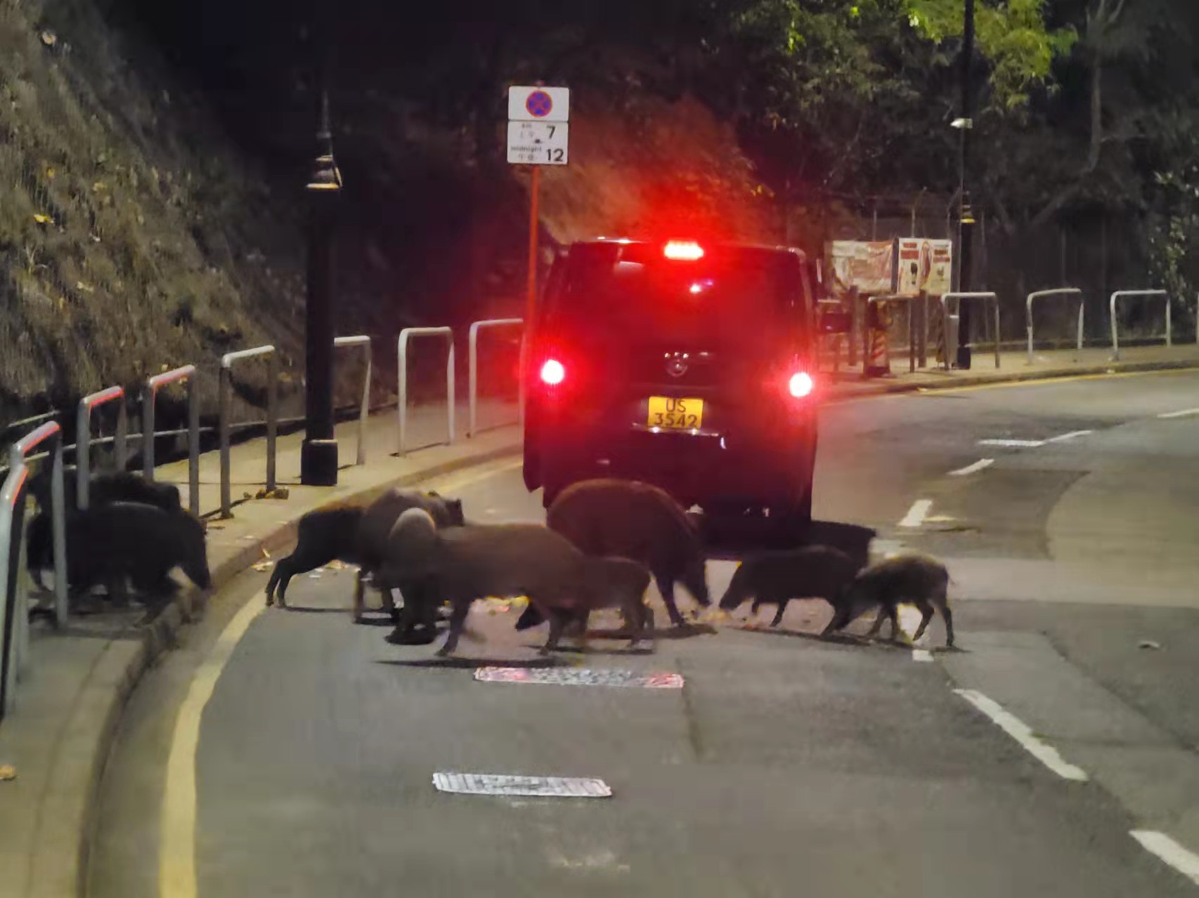 大公文匯全媒體報道,自上周開始,大量野豬出沒市區個別地點聚集或覓食,滋擾問題日益嚴重。今日(17日)晚上近7時,警方接獲市民報案,指黃竹坑深灣道有至少5隻野豬在山邊覓食,警方接報到場。現場所見,數隻野豬於馬路上緩緩步行,時而靠近行人路草叢覓食,時而躺臥於行人路。在場警員遂用鐵馬將附近道路圍封,等待漁護署人員到場協助。