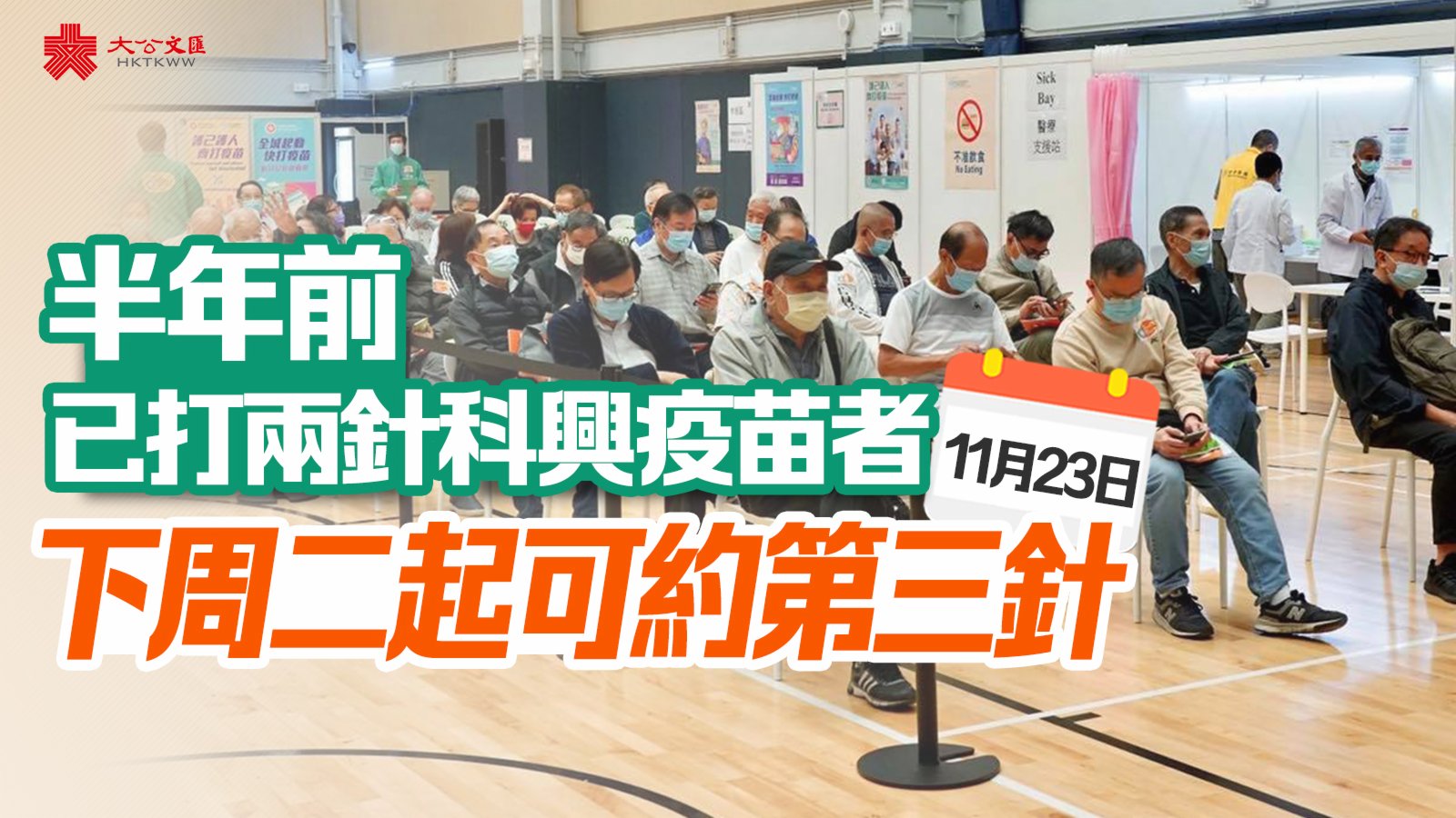 大公文匯全媒體報道,政府今日(18日)公布,市民若已接種兩劑科興疫苗而第二劑疫苗是在六個月前接種,不論他們是否屬於優先組別,均可由11月23日(星期二)開始預約和由當天起接種第三劑新冠疫苗。