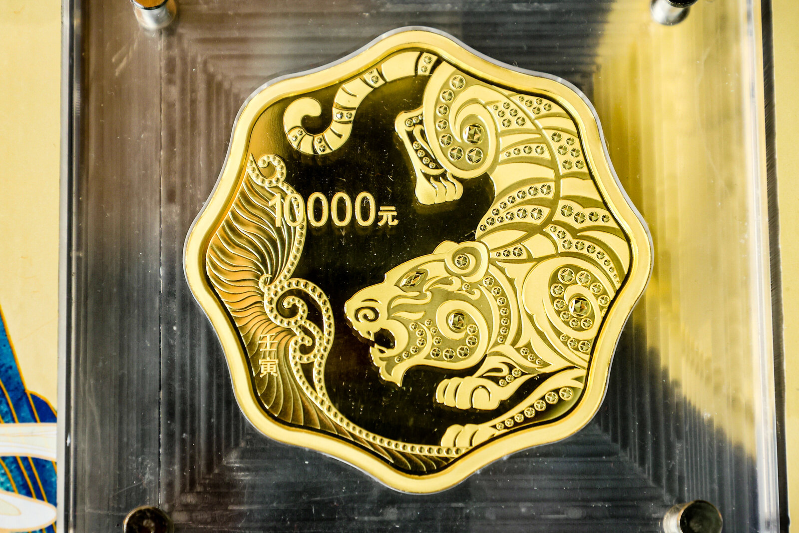 虎年金銀幣均為精製幣,形狀分為圓形、長方形、扇形、梅花形4種。8枚金幣重量分別為10公斤、2公斤、1公斤、500克、150克、15克、10克和3克;5枚銀幣重量分別為1公斤、150克、30克(2枚)和15克。