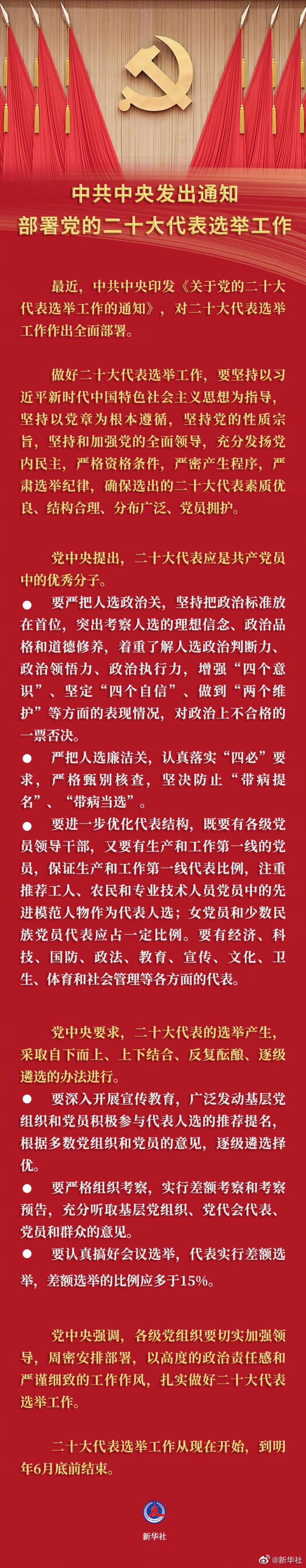 黨中央強調,各級黨組織要切實加強領導,周密安排部署,以高度的政治責任感和嚴謹細緻的工作作風,紮實做好二十大代表選舉工作。要嚴肅政治紀律、組織紀律和選舉紀律,充分運用湖南衡陽、四川南充、遼寧等地拉票賄選、破壞選舉案件,開展警示教育,汲取教訓,引以為戒。加強對代表選舉工作的全程監督,對違規違紀違法問題「零容忍」,一經發現堅決查處,確保風清氣正。要通過做好學習宣傳、組織動員、推薦提名、會議選舉、嚴肅紀律等各項工作,使代表選舉產生過程成為深入學習貫徹習近平新時代中國特色社會主義思想的過程,成為貫徹落實新時代黨的建設總要求和新時代黨的組織路線的過程,成為理想信念教育和黨性黨風黨紀黨史教育的過程,成為黨內政治生活生動實踐和民主集中制教育的過程,進一步增強黨的創造力、凝聚力、戰鬥力,動員廣大黨員、幹部更加緊密地團結在以習近平同志為核心的黨中央周圍,不忘初心、牢記使命,攻堅克難、開拓奮進,為全面建設社會主義現代化國家、奪取新時代中國特色社會主義偉大勝利、實現中華民族偉大復興的中國夢作出新的更大貢獻。