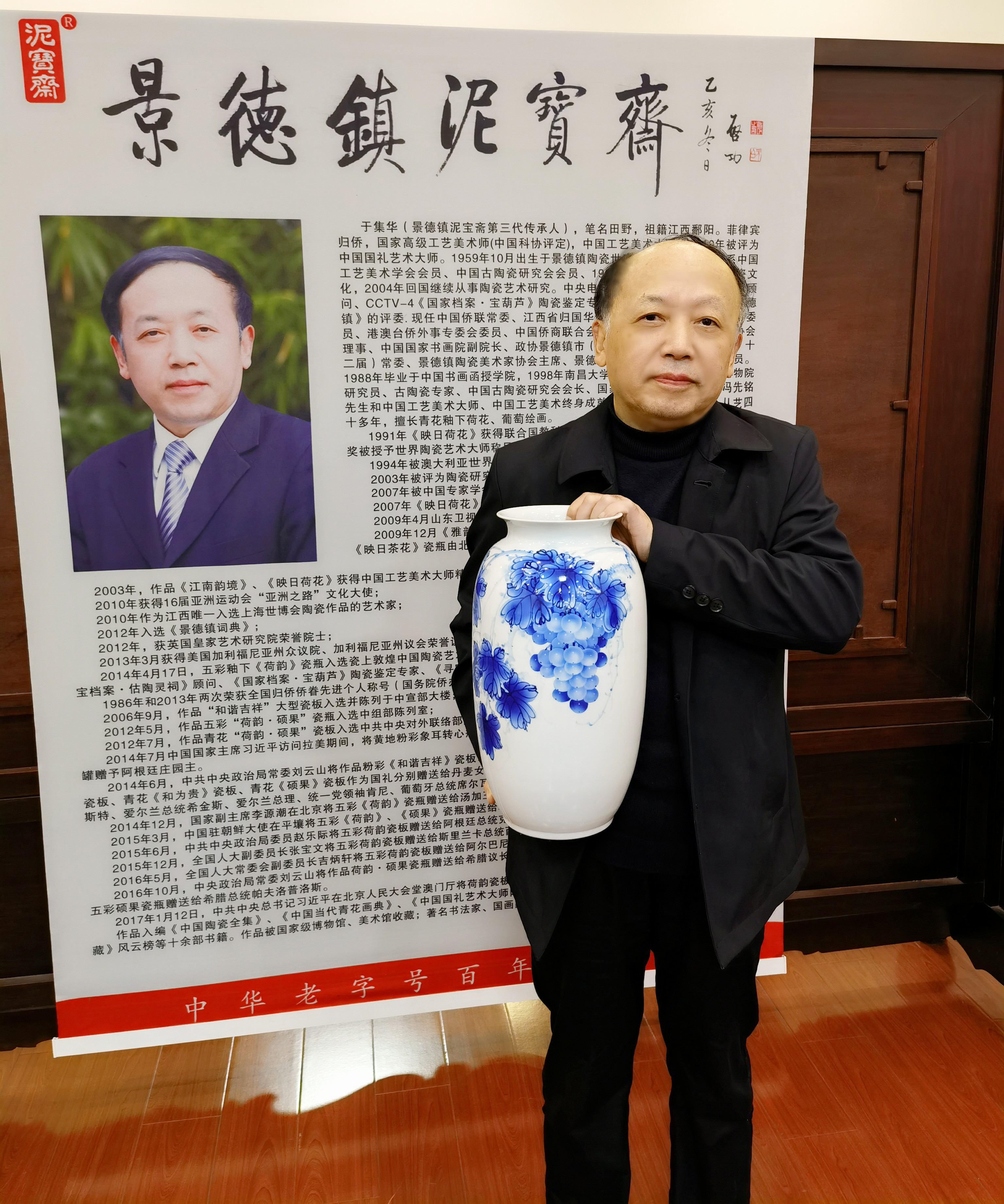 于集華,自稱「畫匠老于」,承襲家族技藝,於1991年自創釉下青花分水肌理紋。他的作品多次作為國禮瓷,被黨和國家領導人贈送給世界各國元首政要。據悉,十三屆全國人大一次會議期間,于集華作為人大代表新面孔,建議國家層面出台相關扶助政策,加大景德鎮手工制瓷技藝人才培養和保護力度;成立專門機構,保護非物質文化遺產;建立「景德鎮手工制瓷技藝」檔案;有計劃地培養新的傳承人。
