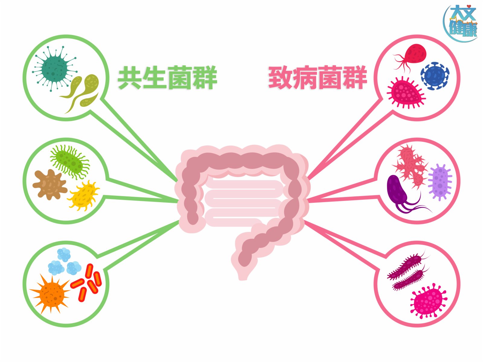 致病菌群包括:沙門氏菌(Salmonella)、幽門螺桿菌(Helicobacter pylori)、甲烷短桿菌(Methanobrevibacter)等,在大部分情況下致病菌都會被共生菌群抑制,防止發病,助人體處於健康平衡的狀態。當腸道病菌失衡時,致病菌就會「興風作浪」,引發多種腸道疾病。