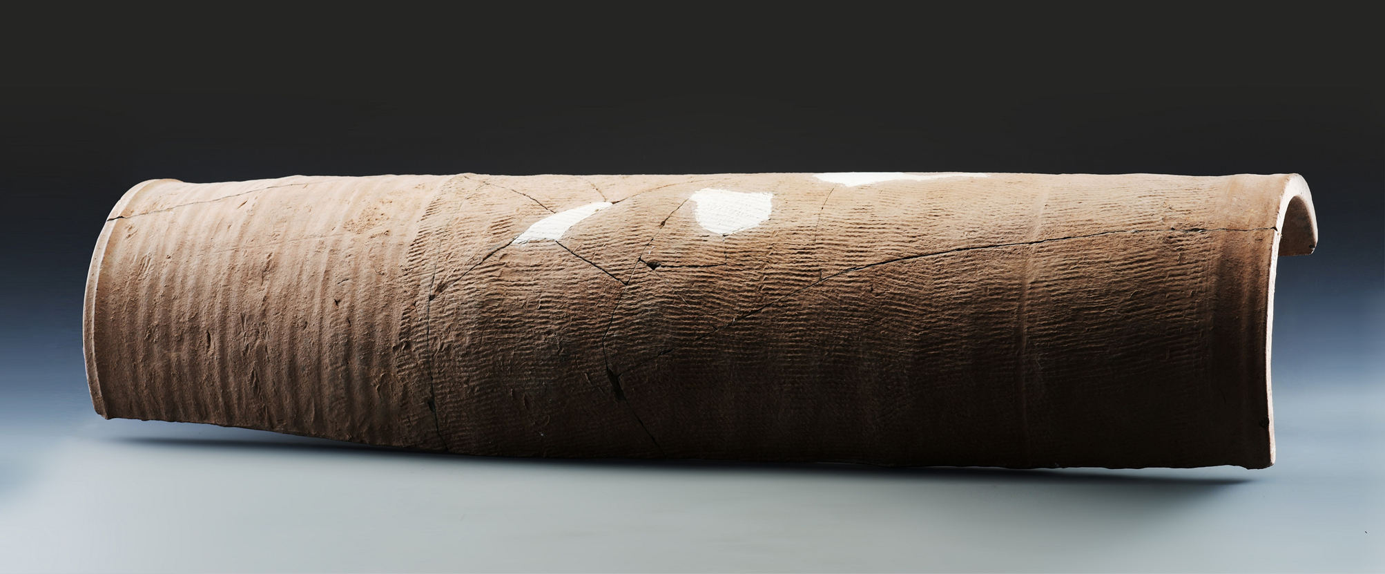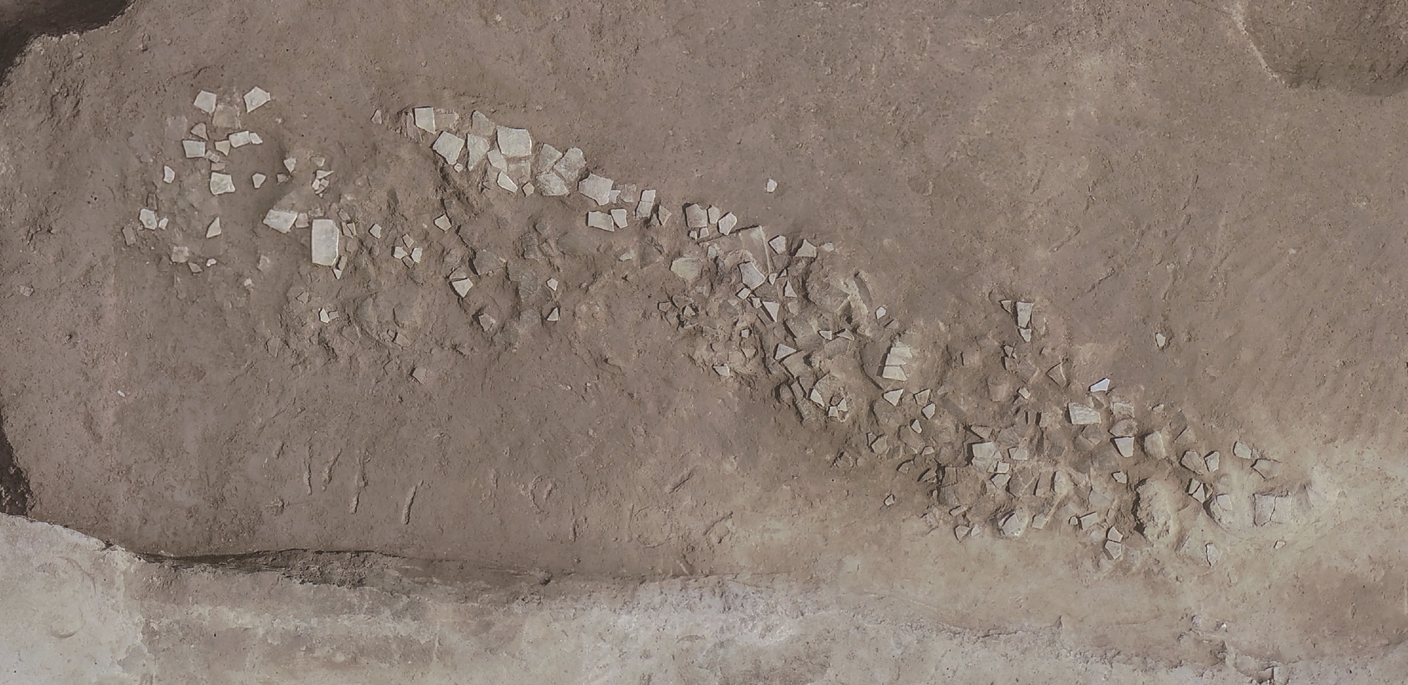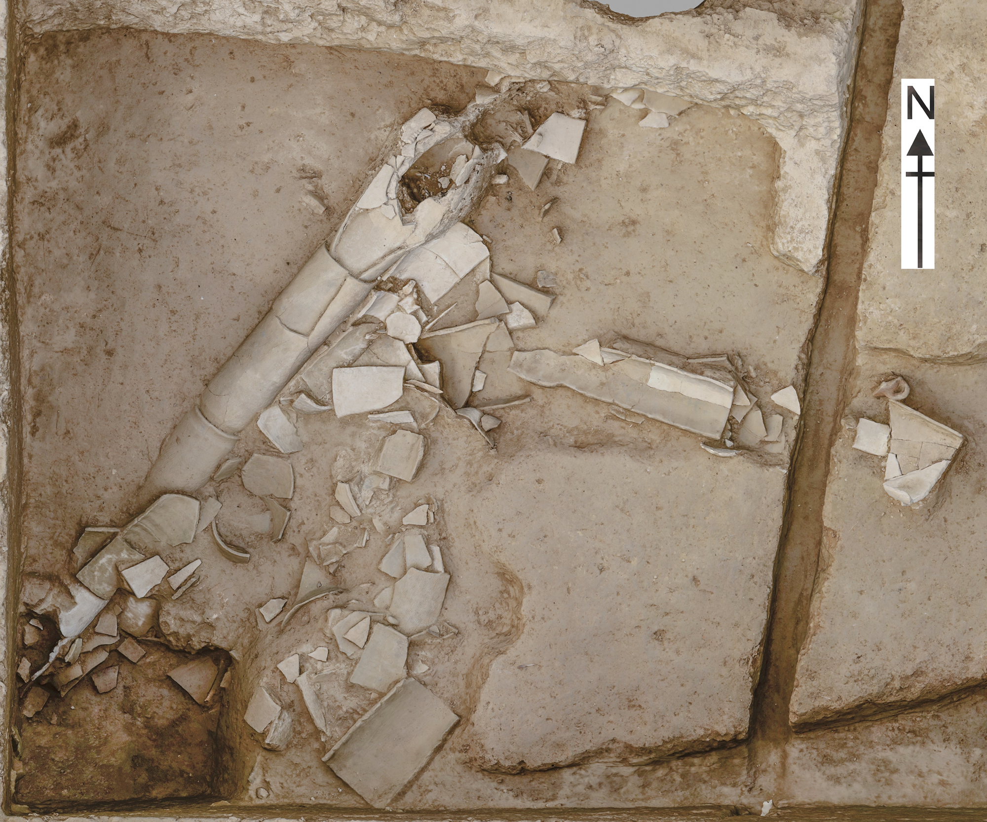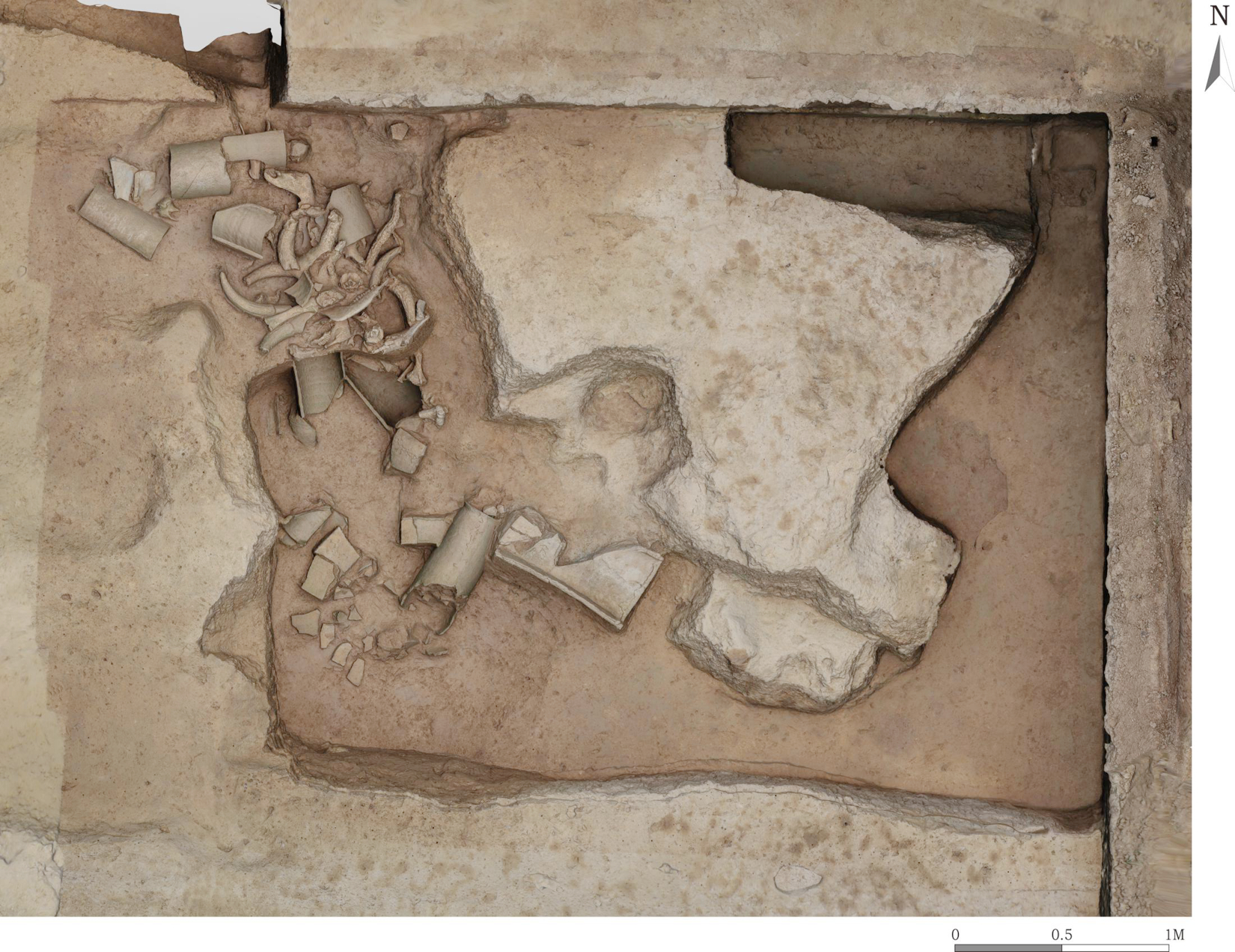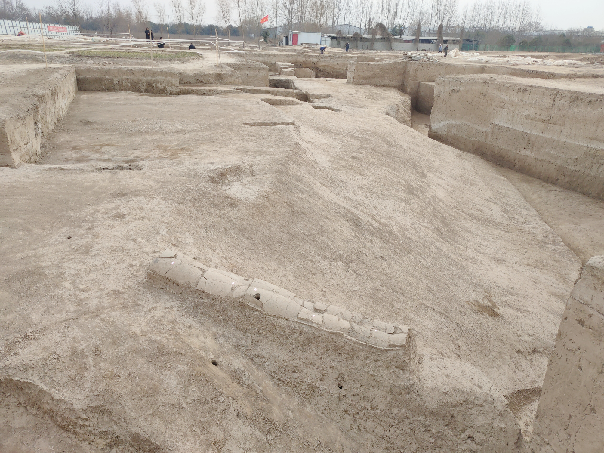 特別引人關注的是,考古工作者在建築基址中南部邊緣發現一段長達3米多的陶排水管道,由4節一頭大、一頭小的圓形陶水管套接而成。陶水管外飾繩紋,內為素麵,直徑約25厘米,長度在0.70至0.85米之間,長短不一,系豐鎬遺址目前發現保存最好的排水管道。除此之外,考古人員還在建築基址南部邊緣的中間位置,首次發現一處房屋建築散水。該散水大體呈東西向,用碎陶片鋪設而成,稍向外(南)側傾斜,殘長4.6米,寬0.5至1.0米。而在建築基址西北部,考古人員亦揭露出一條長40多米、寬約4米,落差約2.0米的夯土護坡(牆)。其中在北邊護坡上,發現一段由5組陶筒瓦相扣而成,總長2.5米、口徑約0.3米的排水管道,為遺址宮殿區所在台地向西邊河道的排水系統。
