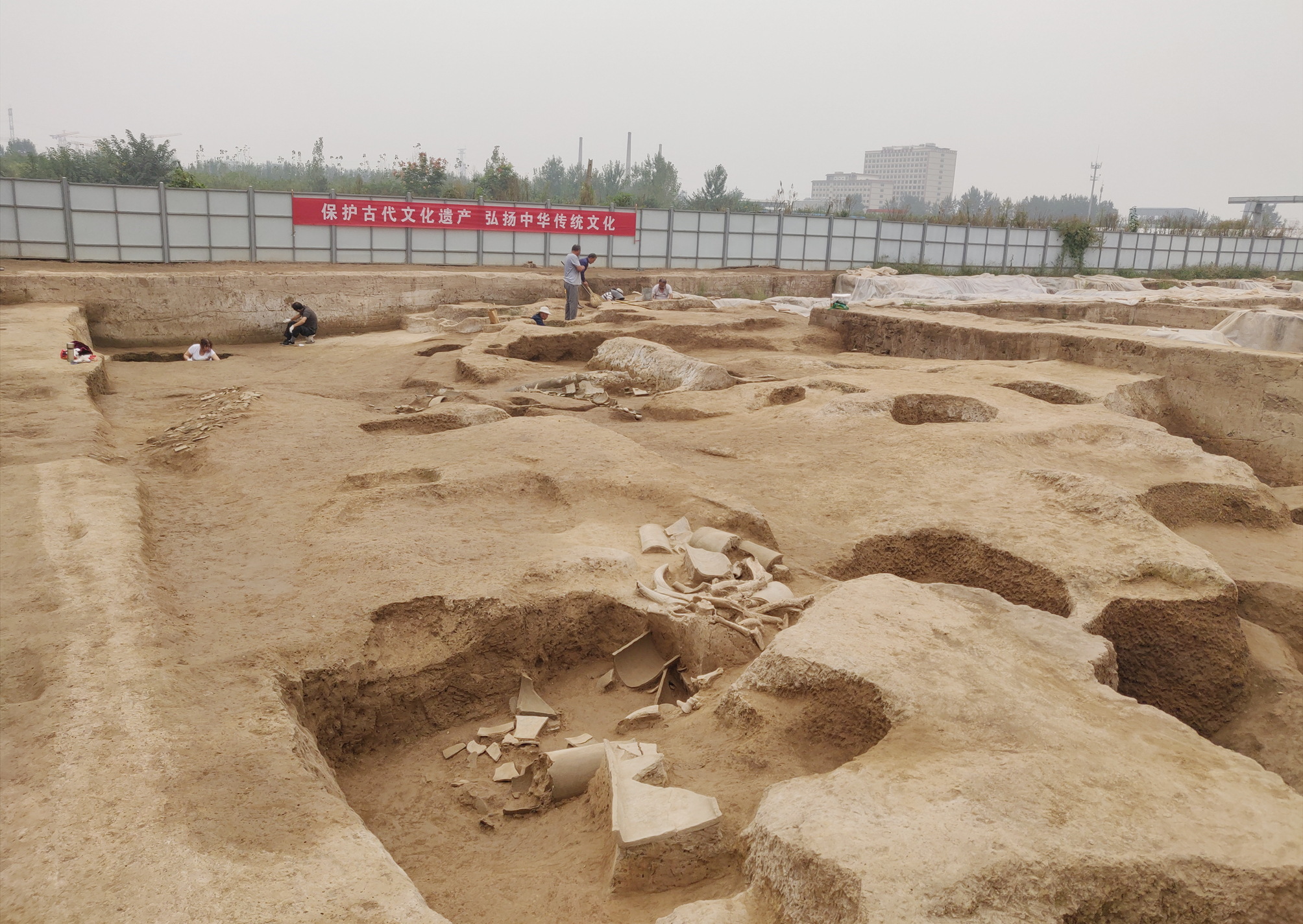此外,考過工作者還在鎬京遺址14號建築基址上發現夯土牆基8道,房子共8間,周邊發現祭祀坑,以及西周道路和車轍。專家指出,基址西周祭祀坑出土了較多的牛、羊、豬、鹿等動物頭骨,與周代天子祭祀天地、祖先、神靈時最高級別的祭品「太牢」用牲種類可對應,推測在該處西周大型建築的分布區域內,可能有國家級的宗廟存在,而距該座祭祀坑最近的14號建築為宗廟的可能性較大。