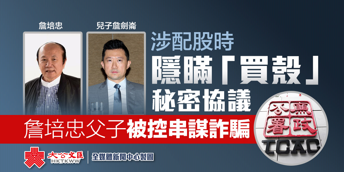 大公文匯全媒體報道,前立法會議員詹培忠及其兒子詹劍崙,涉嫌聯同一名女商人在配售可換股票據以增加上市公司股本時隱瞞秘密「買殼」協議,詐騙聯交所、該上市公司以及其董事會和股東,涉及的犯罪得益逾4000萬元。三人被廉署落案控告,今日(19日)下午於沙田裁判法院首次提堂。法庭批准詹培忠父子各以200萬元現金保釋、不得離港、交出旅遊證件、每星期向警署報到等。案件押後到明年2月28日再訊,以待分析銀行記錄。