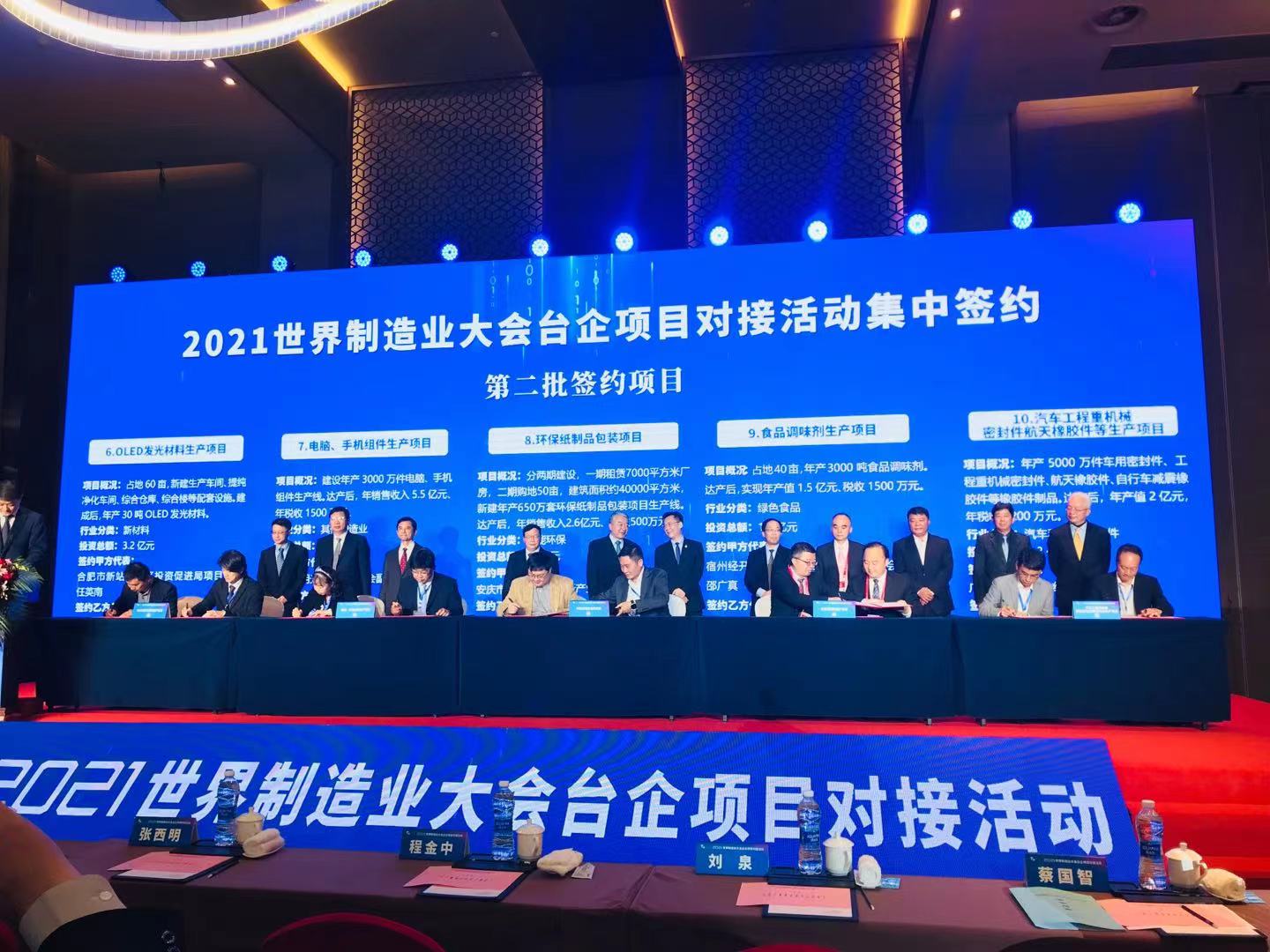 (大公文匯網 記者 趙臣)2021世界製造業大會19日在安徽省合肥市開幕,當日分別舉辦港澳企、台企對接活動。其中港澳企對接活動共有10個項目現場集中簽約,總投資97.6億元(人民幣,下同);台企專場對接活動共簽約台資製造業項目75個,總投資達329.4億元。
