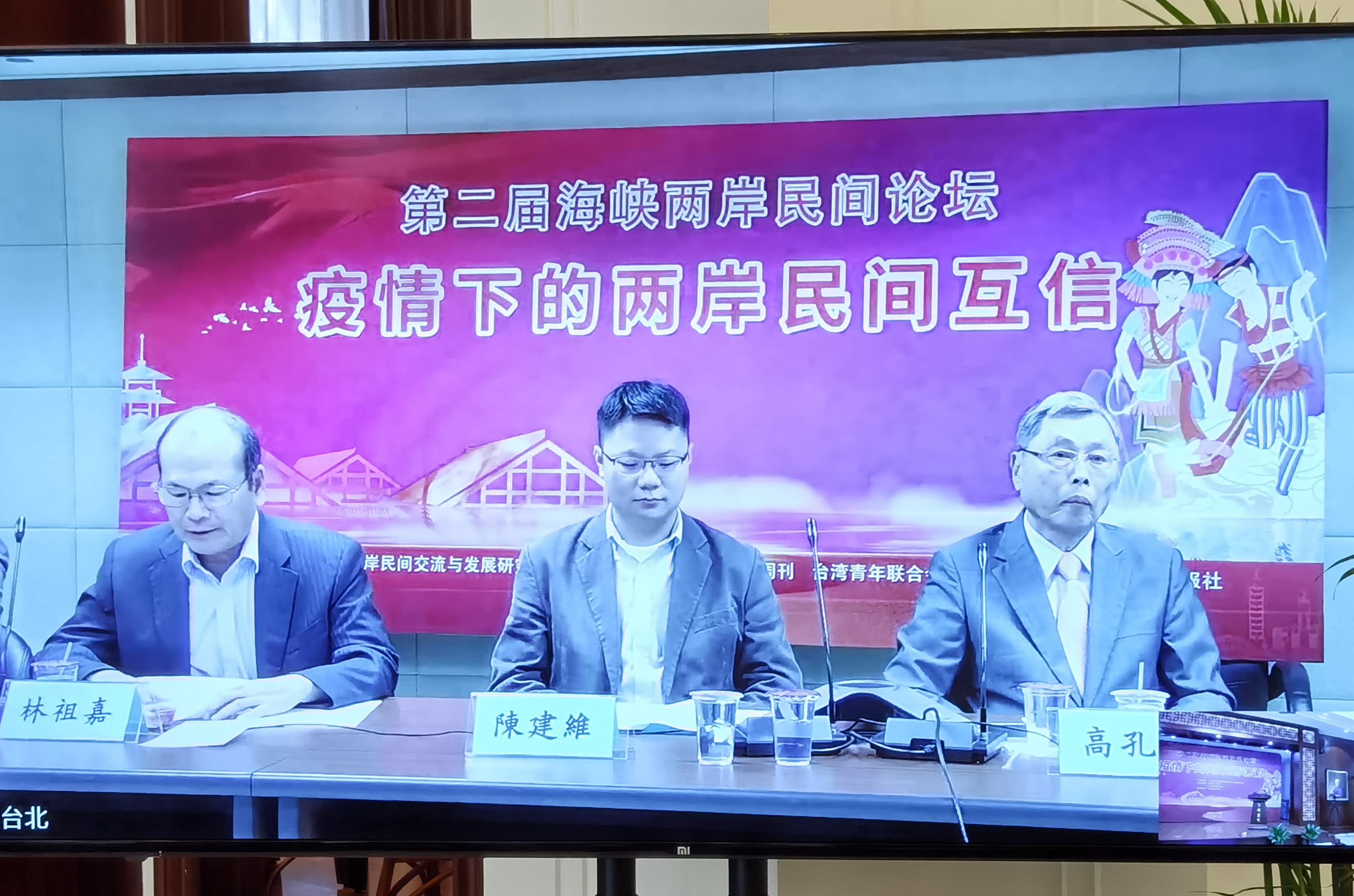 中國國民黨主席特別顧問、大陸事務部主任林祖嘉,海峽兩岸經貿文化發展協會理事長、海基會原副董事長高孔廉,台北市議員秦慧珠,台灣民眾黨中評委張凱鈞,台灣青年聯合會秘書長陳建維等在台北會場通過連線視頻對疫情防控條件下開展兩岸交流獻計獻策。