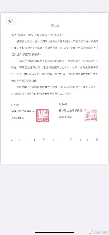 大公文匯全媒體報道,台灣女藝人大S(本名徐熙媛)被曝11月向法院訴請離婚,和內地富二代汪小菲的10年婚姻告終。大S今日(22日)首度通過媒體發表律師聲明,表示兩人已決定和平解除婚姻關係,未來將以朋友身份愉快相處。