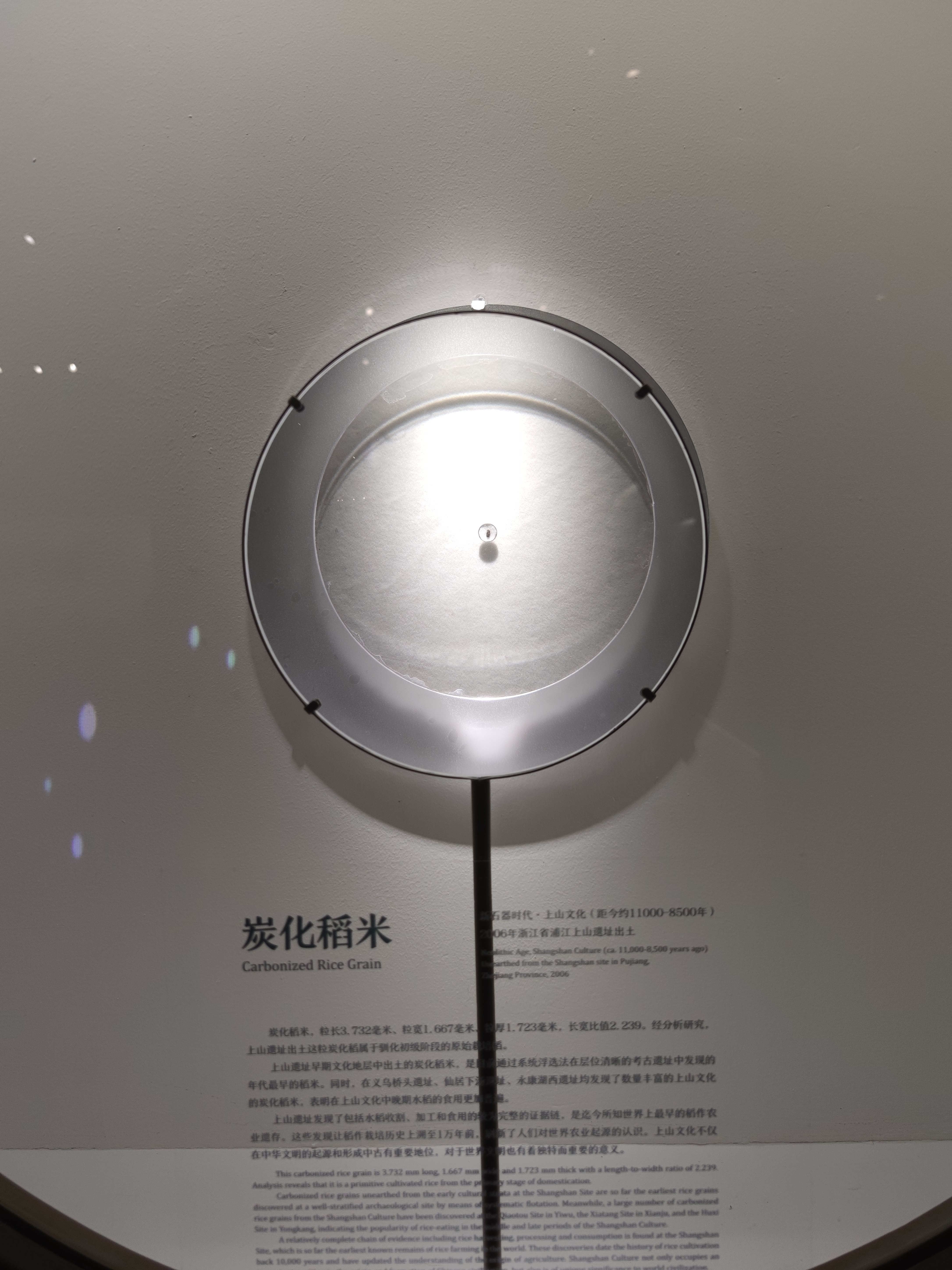 今次展覽的「c位」留給了一粒距今約11000-8500年的炭化稻米,在展廳內獨享一整個封閉展台,吸引不少觀眾駐足。據介紹,這粒碳化稻米於2006年在浙江省浦江上山遺址出土,屬於馴化初級階段的原始栽培稻。上山遺址早期文化地層中出土的炭化稻米,是目前通過系統浮選法在層位清晰的考古遺址中發現的年代最早的稻米。