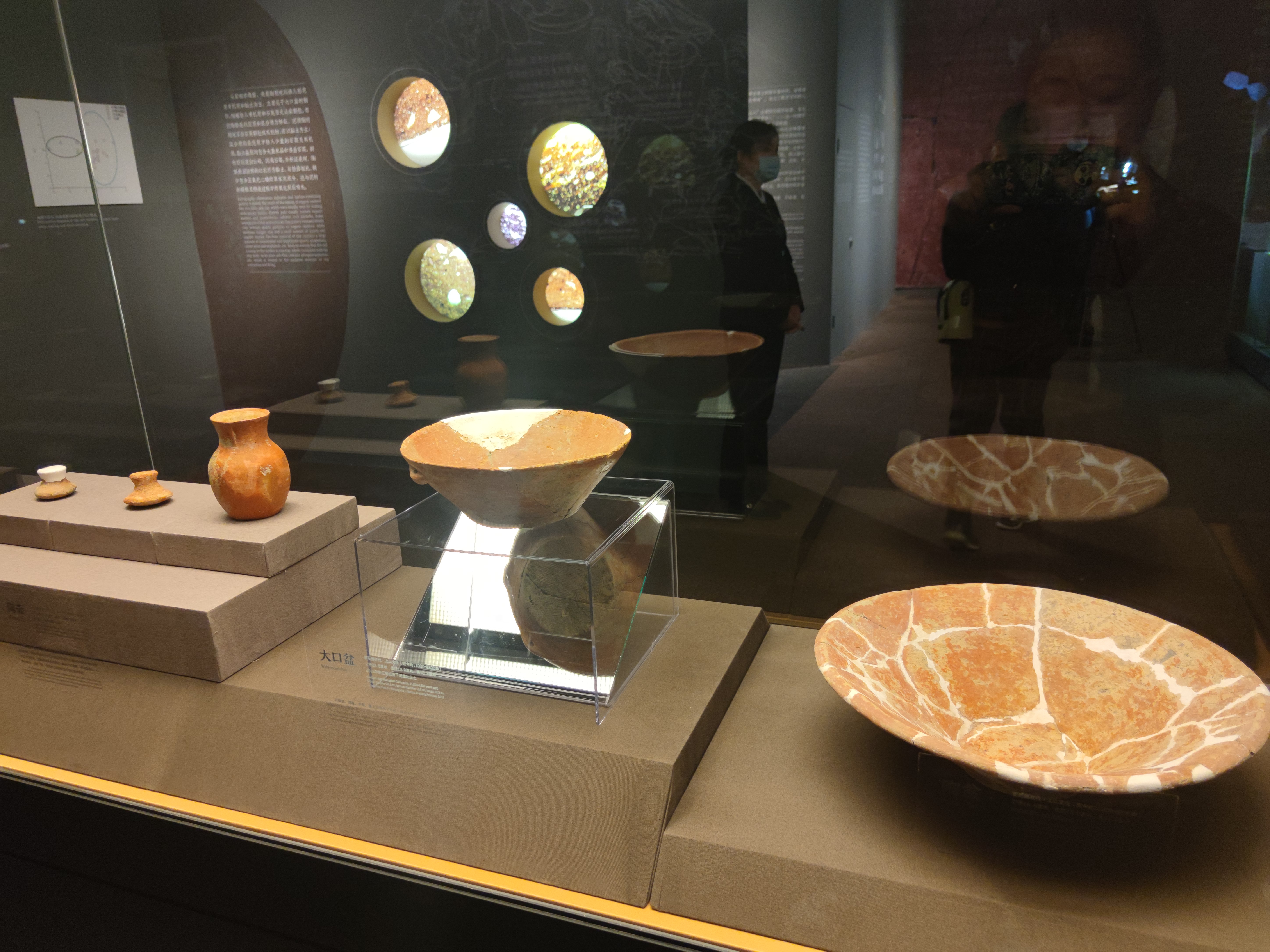 展覽還展示了一件距今約11000-8500年的彩陶壺,壺中發現了釀酒的證據。據悉,在壺內的殘餘物中有一種加熱產生的糊化澱粉,經檢測研究,發現殘留物與低溫發酵的損傷特徵相符,而低溫發酵是釀酒的基本原理。因此,9000年前的上山人可能已經掌握釀酒技術,而這隻陶壺就可能是中國最早的酒器。