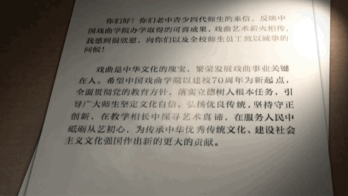 2020年10月,中國戲曲學院的老中青少四代師生代表,在中國戲曲學院建校70周年之際,給中共中央總書記習近平寫信匯報了學院70年來的發展情況。他們很快收到了習近平總書記的回信。