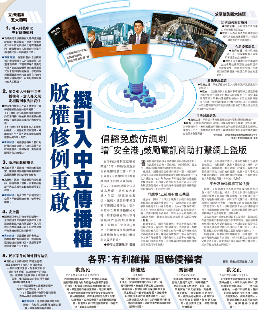 (香港文匯報記者 邵昕)香港的版權制度落後國際逾10年,特區政府重啟更新版權制度工作,昨日起就修訂《版權條例》展開為期3個月的公眾諮詢,並以2014年的相關立法建議為基礎,提出五大範疇,包括:建議豁免戲仿、諷刺、評論時事等目的而使用版權作品;引入科技中立專業傳播權的同時,對未授權者向公眾傳播版權作品施加刑事制裁;並增訂「安全港」條文,鼓勵連線服務提供者與版權擁有人合作打擊網上盜版活動等。