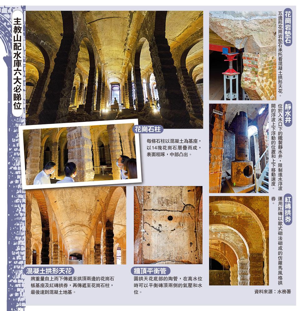 現場所見,配水庫頂部加設玻璃天窗,內部鋪設架高的木板步道,遊人可從不同高度觀賞配水庫。通道內也加設了低紫外線照明設備,方便遊人在較暗環境下亦可清晰欣賞仿羅馬式的紅磚拱券、花崗石柱等特色建築細節。場內並配備滅火筒、火警偵測和警報系統等,保障參觀市民安全。
