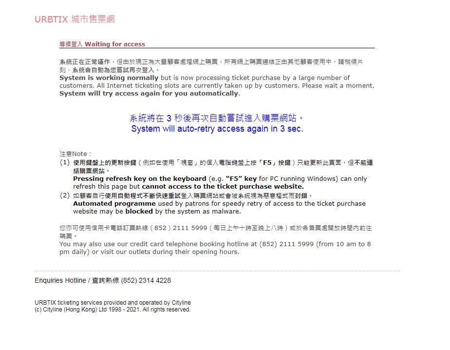 記者今早準時登入城市電腦售票網站,但估計市民熱情高漲急住撲飛,導致系統繁忙,等待超過20分鐘仍未能成功進入購票畫面。期間網站一直有提示指,「由於現正為大量顧客處理網上購票,所有網上購票連結正由其他顧客使用中,請稍候片刻,系統會自動為您嘗試再次登入」。