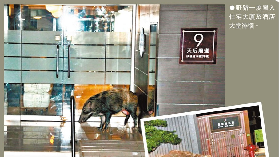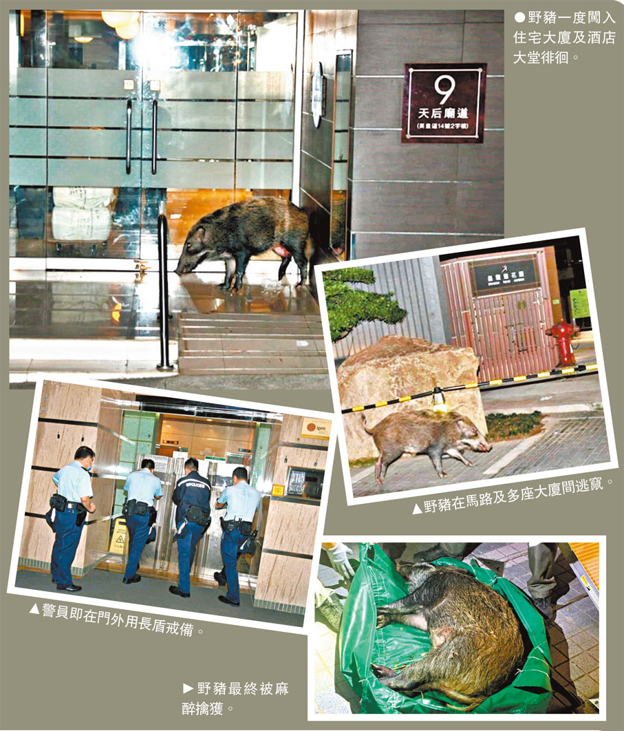 (香港文匯報記者 蕭景源)月初發生野豬噬傷警員的香港北角天后廟道,前晚再有一頭重達60公斤的大野豬出沒覓食,因曾被困山坡鐵絲網掙脫致後腳受傷亂竄,驚動居民報警。警員和漁護署人員奉召到場圍捕,野豬則在馬路及多座大廈間逃竄,一度闖入住宅大廈及酒店大堂徘徊,擾攘近4小時至昨日凌晨始被發射麻醉槍制服抬走,但最終因傷重須人道毀滅。本月25日晚上,同在天后廟道亦有一頭大野豬因頭部被卡鐵欄重傷,要人道毀滅。而前晚再有一名外賣員在香港仔田灣邨遭野豬噬傷大腿。香港特區政府環境局局長黃錦星認為野豬習性改變,不論傷人與否也對市民構成危險(見另稿)。