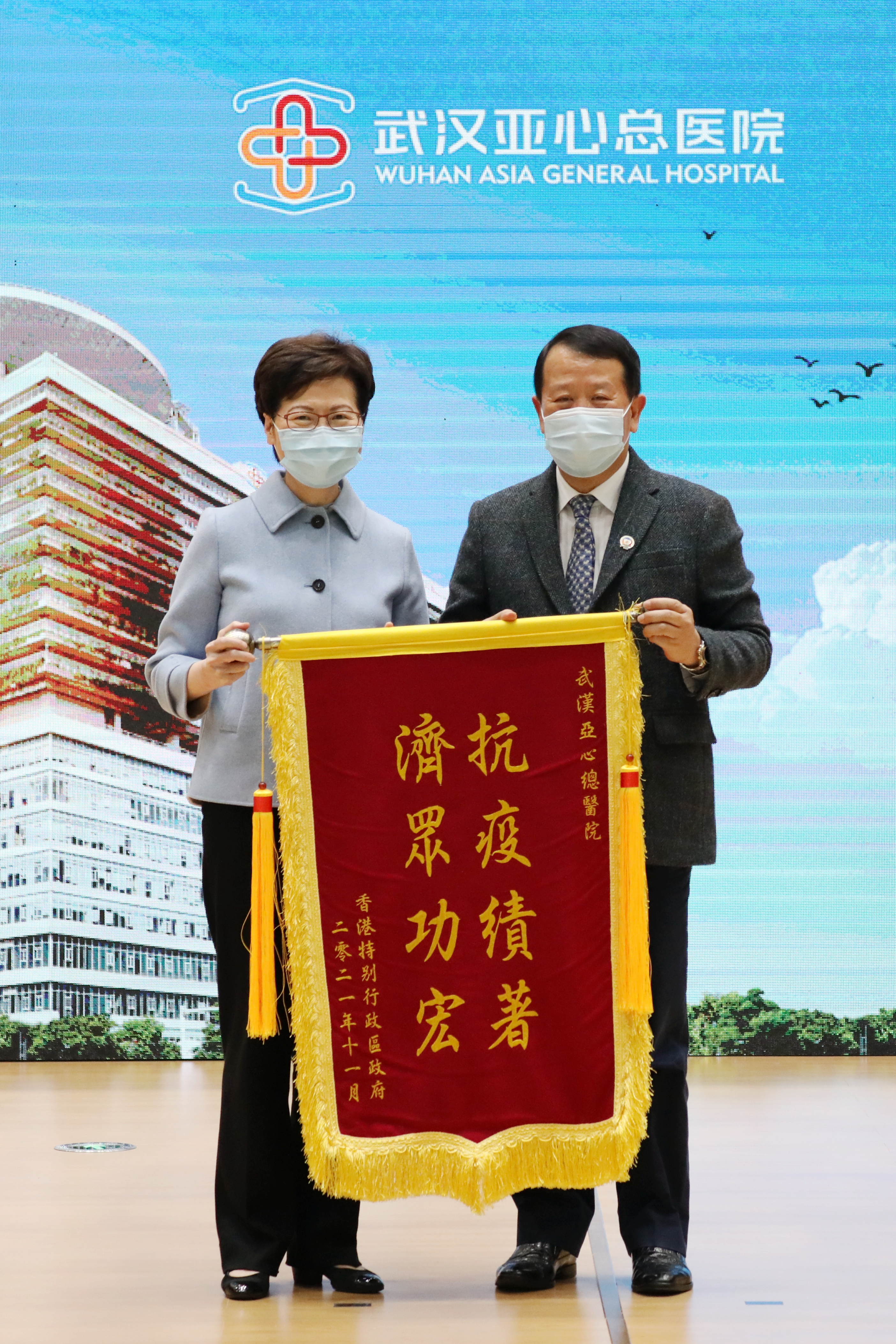 (大公文匯網記者 俞鯤、實習記者潘鄰安)11月29日,行政長官林鄭月娥率領香港特區政府代表團首站前往位於武漢經開區的武漢亞心總醫院考察參觀醫院設施,同醫護人員座談,並向亞心總醫院董事長謝俊明授予「抗疫績著,濟眾功宏」的錦旗。她表示,此行籌備時就特別想看看港人在武漢開辦的醫院,親自向武漢的抗疫英雄表達感謝。她亦透露,經過醫護的共同努力,透過內地返港防疫措施,返回的50多萬人次中至今無一例感染。