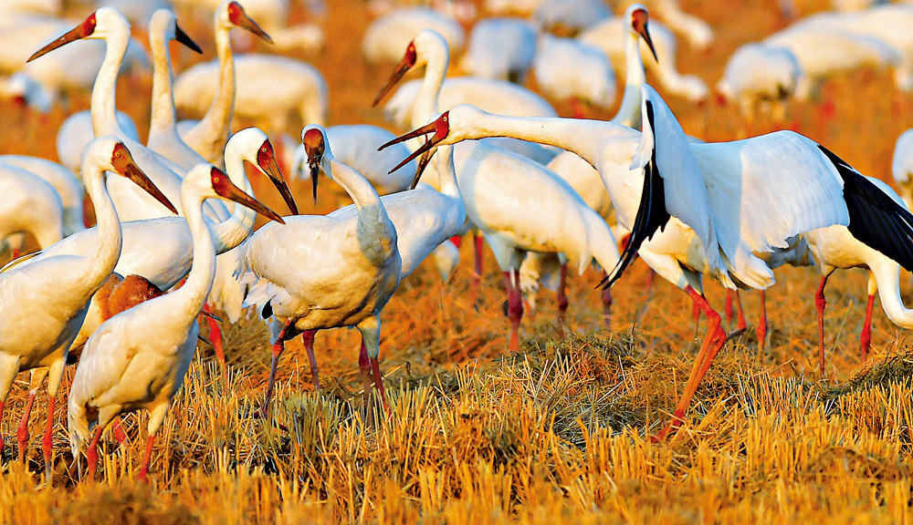 (大公報記者 王逍)深冬季節,鄱陽湖畔的康山墾殖場插旗洲分場是一座蔚為壯觀的候鳥樂園。陽光溫暖柔和,陣陣鳥聲和鳴,白雲掩映下,密密麻麻的候鳥展翅翱翔;千畝金黃稻田裏,候鳥集結,或嬉戲或進食。近日,包括白鶴、白頭鶴、白枕鶴、灰鶴在內,數量達數千隻的鶴群在江西余干縣康山墾殖場插旗洲分場的稻田裏取食,場面頗為壯觀。當地政府專門為這些遠道而來的「客人」預留了近1000畝水稻,讓牠們食物無憂、棲息安全。