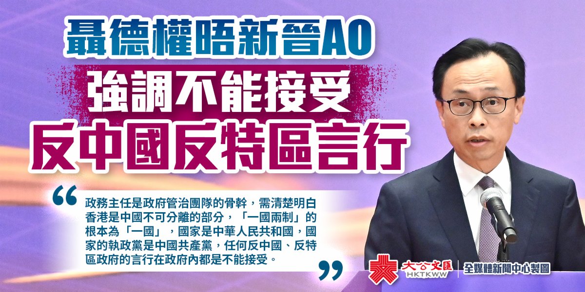 大公文匯全媒體報道,公務員事務局局長聶德權昨日(29日)與86位在這3年加入政府的新晉政務主任會面,並強調政務主任是政府管治團隊的骨幹,任何反中國、反特區政府的言行在政府內都是絕對不能接受的。