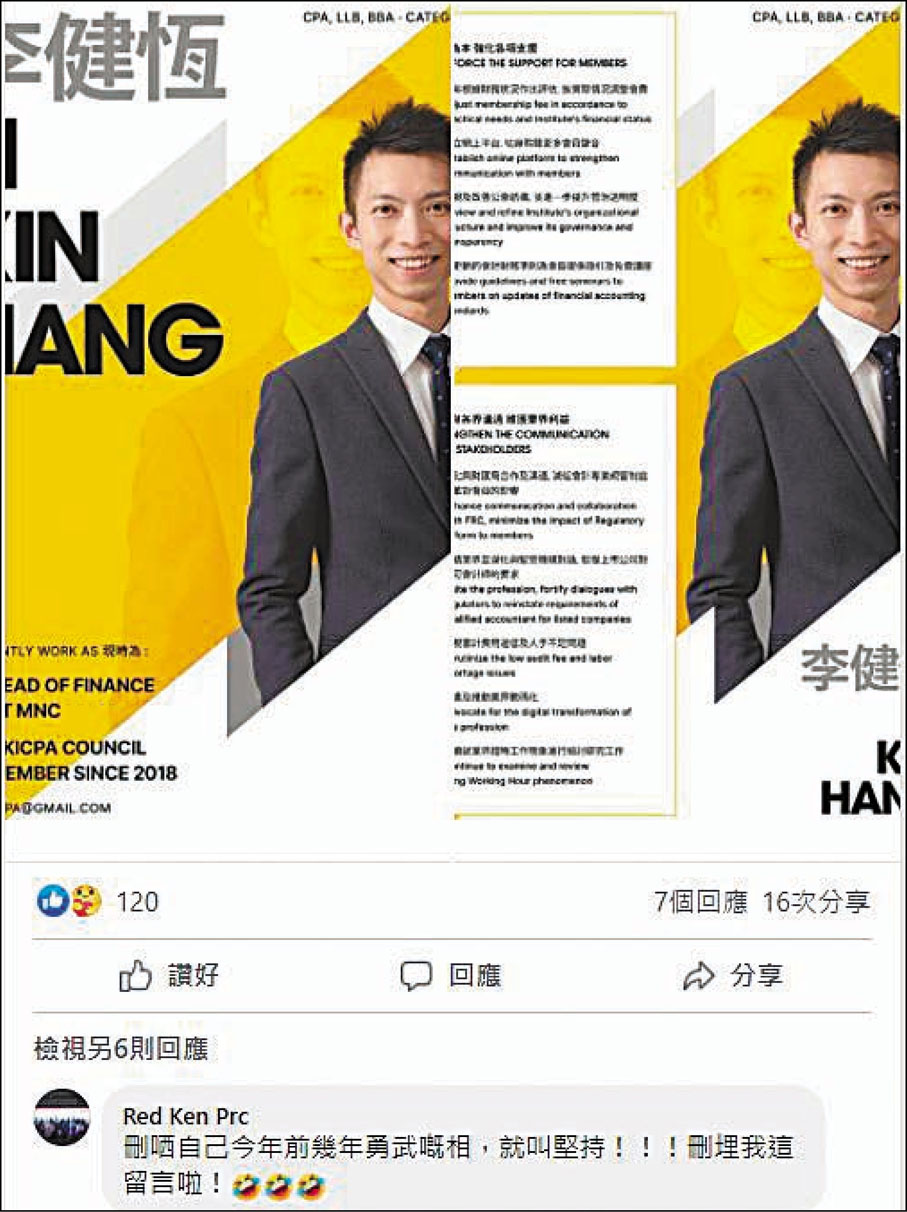 (香港文匯報記者 鄭治祖)香港會計師公會(HKICPA)正舉行理事會選舉,選舉改選7個理事席位,15人報名競逐。香港文匯報近日收到讀者爆料,指參選人之一、現任會計師公會副會長李健恆曾在facebook中多次散布鼓吹「光復香港」、稱中國為「中共國」,以及「香港被併入中共國」等涉嫌「港獨」言論,並提供相關帖文影印資料。多名政界人士昨日接受香港文匯報記者訪問時表示,會計師公會理事必須為愛國者,他們擔心,若會計師公會政治化,將不利於國家提供更多優惠政策,對香港融入國家發展大局沒有好處,並提醒選民注意。
