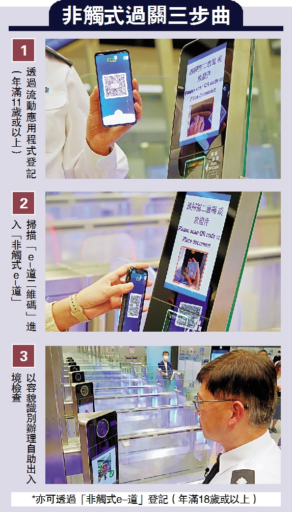 「非觸式e-道」服務會率先在機場、港珠澳大橋及深圳灣管制站使用,每個出入境關口設有約10條「非觸式e-道」,未來亦計劃將所有e-道「升級」,並會研究明年開放予旅客使用。據悉,新措施的系統有超過99%準確度,其他國家包括德國、澳洲及新加坡亦有使用。
