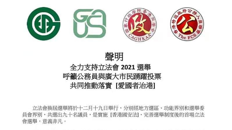 最後,四團體呼籲公務員同事和市民積極踴躍投票,選賢能,為香港開創新局面,共同推動落實「愛國者治港」。