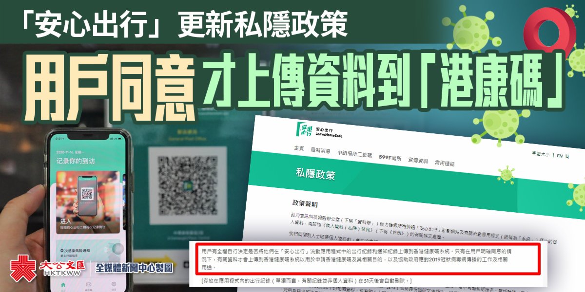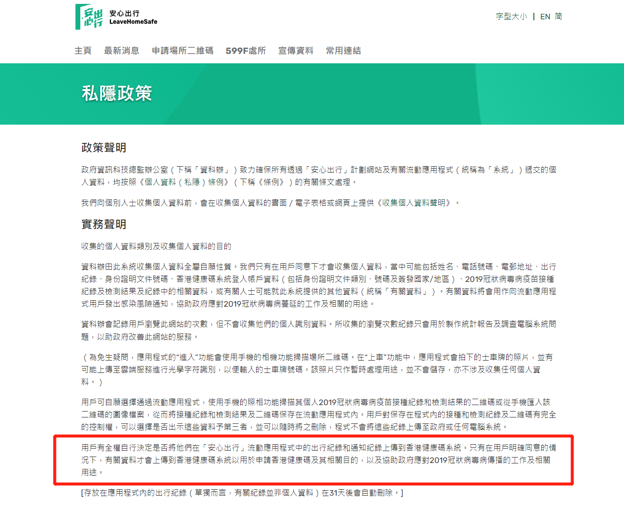 「安心出行」網頁更新後的私隱政策,當中在「實務聲明」部分,列明用戶有全權自行決定是否將他們在「安心出行」流動應用程式中的出行記錄和通知記錄,上傳到「香港健康碼」系統。只有在用戶明確同意的情況下,有關資料才會上傳到「香港健康碼」系統以用於申請「香港健康碼」及其相關目的,以及協助政府應對新冠病毒傳播的工作及相關用途。