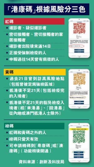 市民提交申請後,會經系統比對資料,產生紅、黃或綠色「港康碼」。政府資訊科技總監辦公室副資訊科技總監黃志光說,確診者、疑似確診、檢疫人士、密切接觸者及自行申報帶有病徵人士,港康碼會是紅色;在21日內曾到訪強制檢測區域,抵港未滿21日等會得到黃色港康碼,其他人士就是綠色;而獲綠色碼的人士可申請轉碼到「粵康碼」或「澳康碼」。