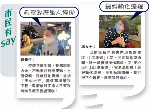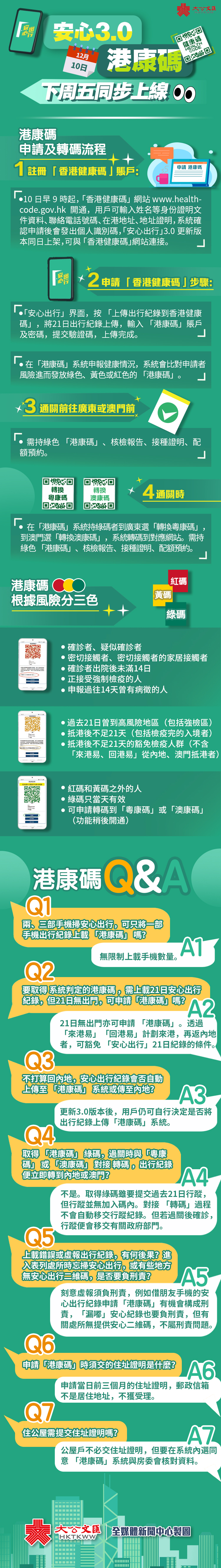 下星期五(10日)早上九時起,市民可透過網址www.healthcode.gov.hk,以實名制登記,限時45分鐘內填寫聯絡電話號碼、居住地址等資料,並上載在港住址證明以註冊「港康碼」賬戶。同日「安心出行」會升級至3.0版本,並提供連結「港康碼」的按鈕,希望豁免隔離回內地人士,需配合上傳「安心出行」的21天出行紀錄及網上申報健康,以申請「港康碼」,意味市民必須在回內地前至少21天用「安心出行」。