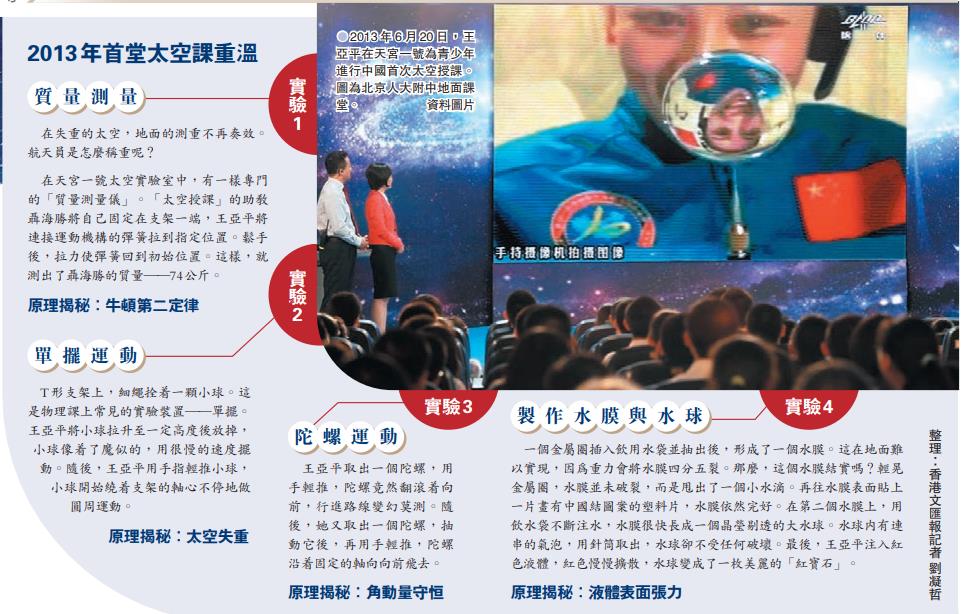 香港文匯報綜合記者劉凝哲及中國載人航天微信公眾號報道,時隔八年,王亞平老師的太空課堂即將再次開講。2013年6月20日,參與神舟十號乘組任務的王亞平在聶海勝、張曉光協助下進行首次太空授課,全國6,000餘萬中小學生觀看授課直播。八年前播下的「航天種子」已經萌芽成長,當年和全班50多名同學一起觀看「太空第一課」的王楠,在高考填報志願時選擇了與航天相關的專業,六個平行志願的首選專業全部填寫了「自動化」或者「測控」,研究生階段又被保送至北京航天航空大學,如今正式成為了一名航天人。