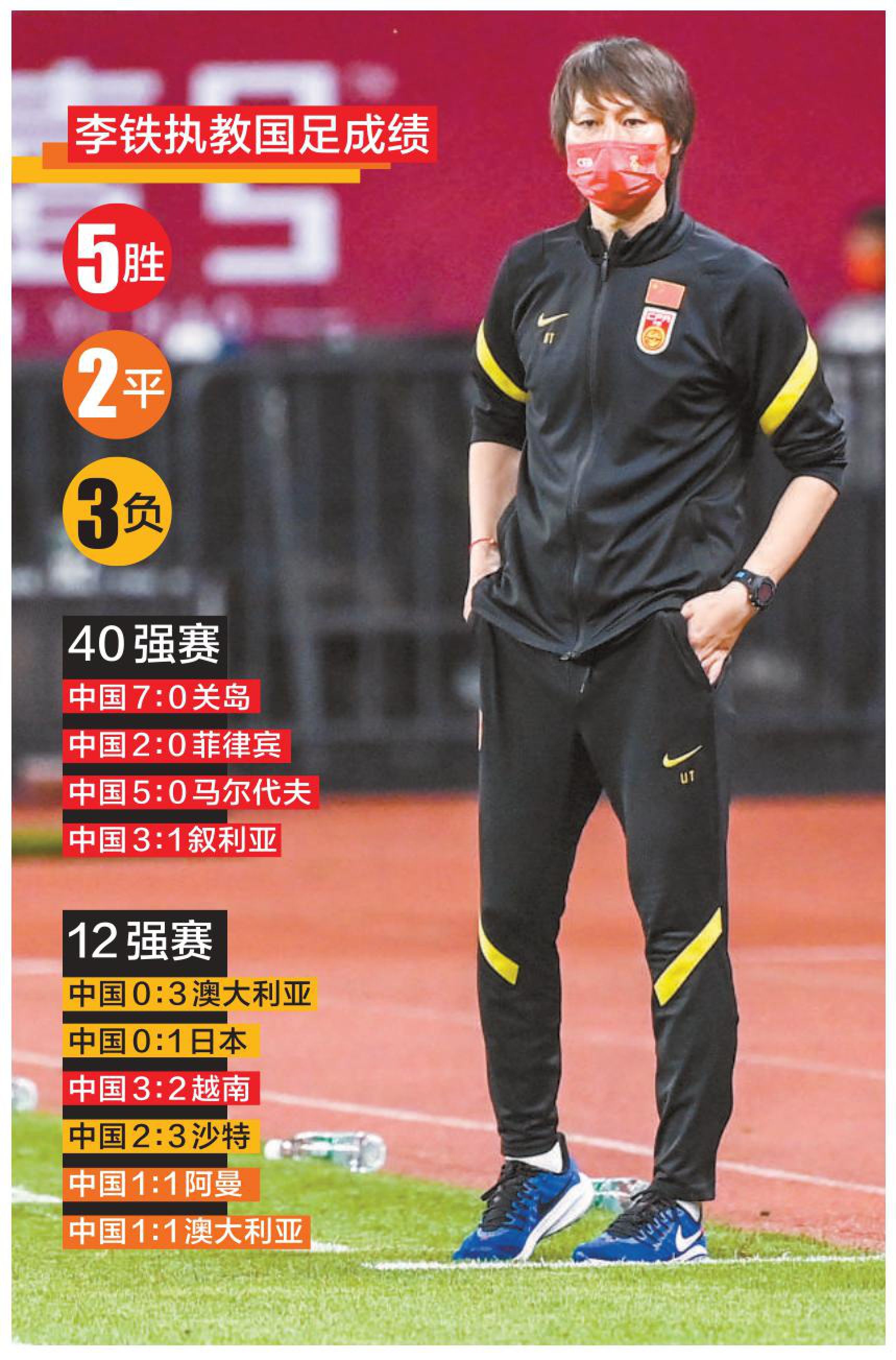 翻查資料,李鐵自2020年1月2日擔任國家隊主教練以來,在世預賽亞洲區40強賽帶隊取得4戰全勝,晉級12強賽。但在12強賽期間,國足6戰僅1勝2平3負,目前排名小組第五,晉級世界盃的可能性微乎其微。