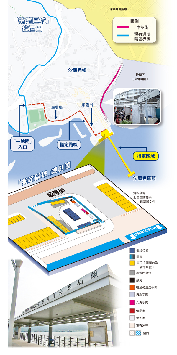 沙頭角碼頭對出的「指定區域」將增建設施,以迎接甚少有機會到禁區觀光的旅客。該區域位於政府閒置的土地及海濱位置上,政府計劃在「指定區域」加建3個旅遊巴停車位;洗手間;可供16個露天攤檔運作的位置;供遊客拍照的「打卡位」;及設有 1.4 米高圍欄及 1.4 米高摺閘。