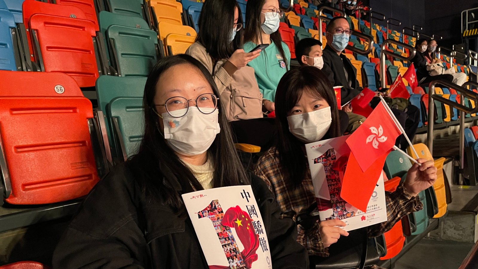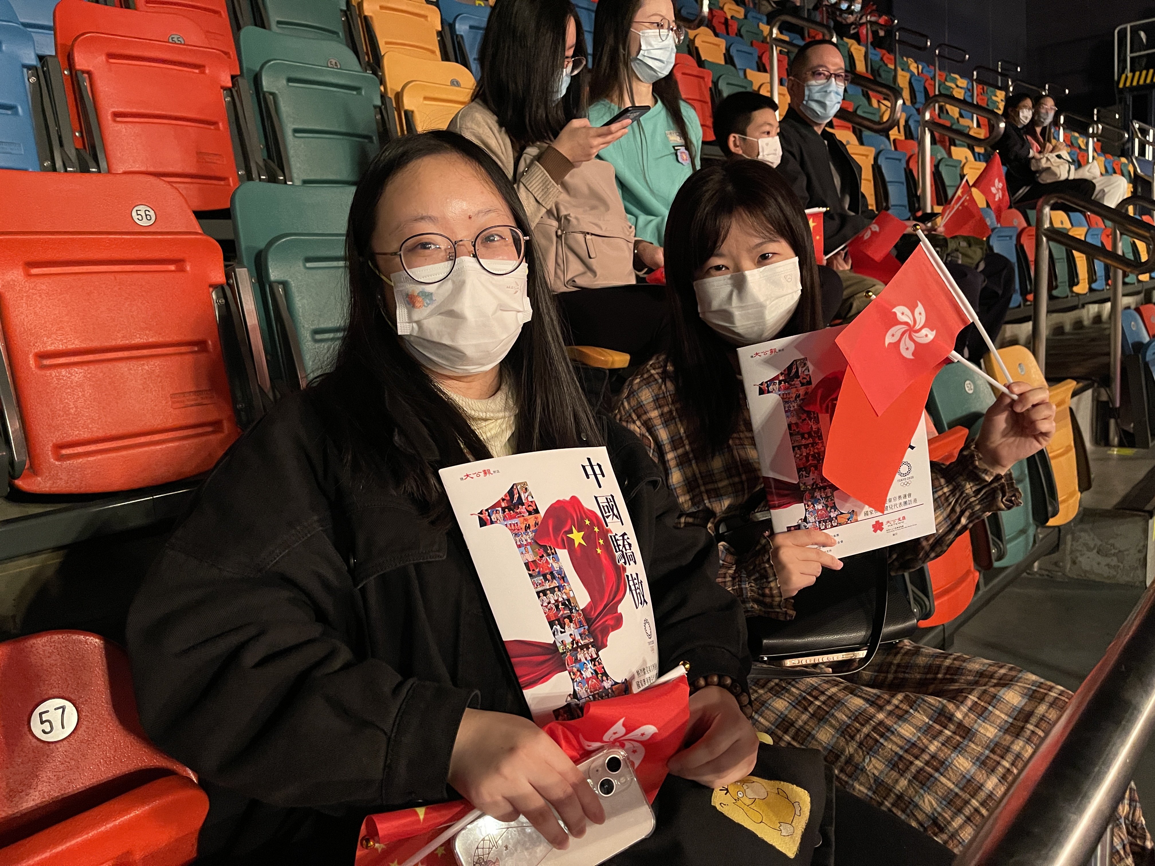 市民蘭小姐與朋友向鏡頭展示國旗和區旗,還有大公文匯的特刊,她們坦言國家隊奧運健兒訪港是次難得的機會,表示最想看到馬龍和許昕的乒乓球才藝展示。