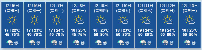 大公文匯全媒體報道,天文台今日(4日)指,東北季候風持續為華南帶來晴朗及非常乾燥的天氣。本港下午大部分地區的相對濕度在40%或以下。乾燥的東北季候風會在下周持續影響華南沿岸地區。