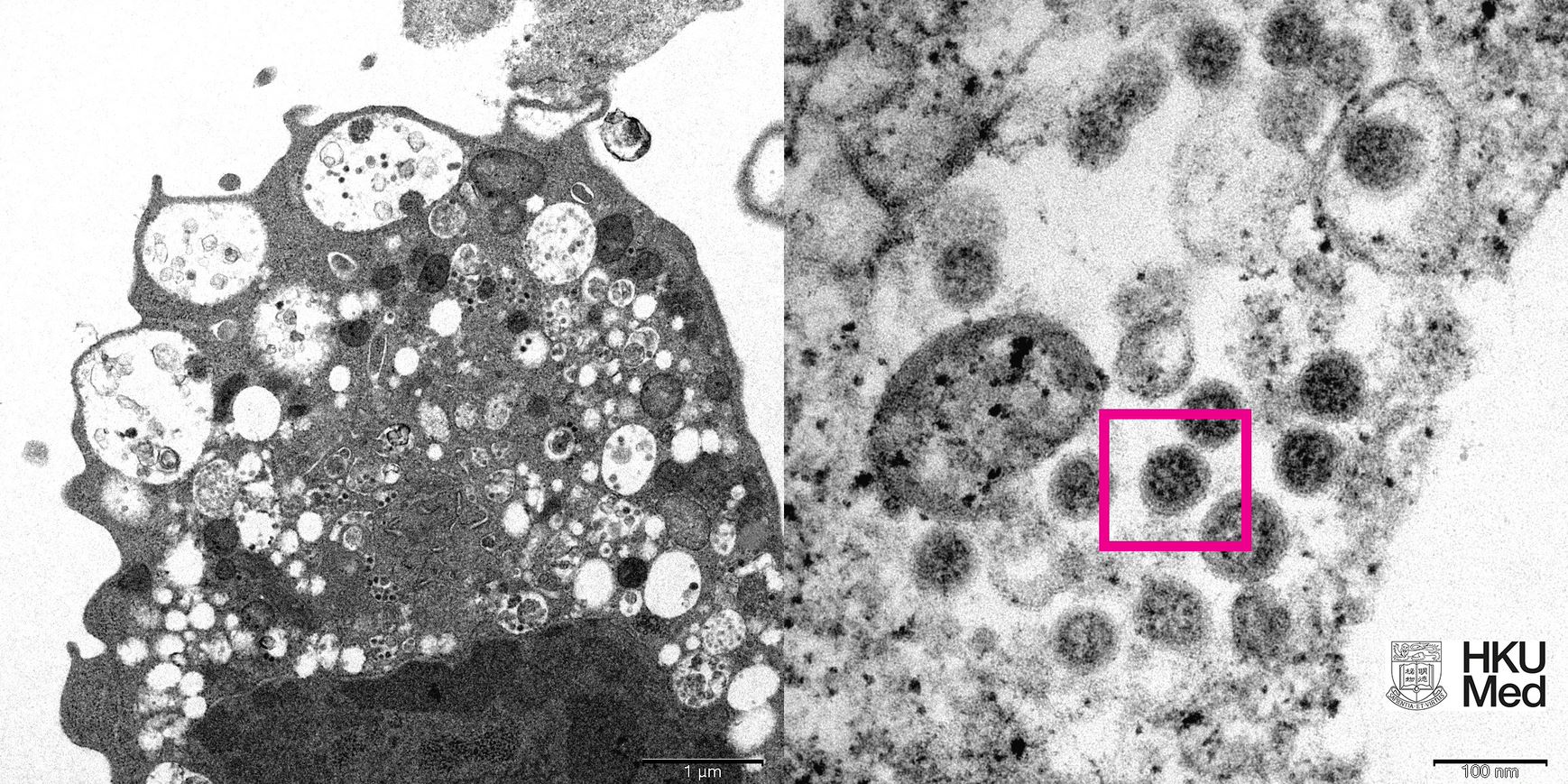 研究人員在低倍電子顯微鏡下,觀察感染新型冠狀病毒Omicron變異株後的猴腎細胞(Vero E6)。照片顯示細胞受損,腫脹囊泡,囊泡內含有黑色小病毒顆粒;在高倍電子顯微鏡下,觀察受感染的Vero E6細胞,照片顯示病毒顆粒表面呈現皇冠形的刺突蛋白。