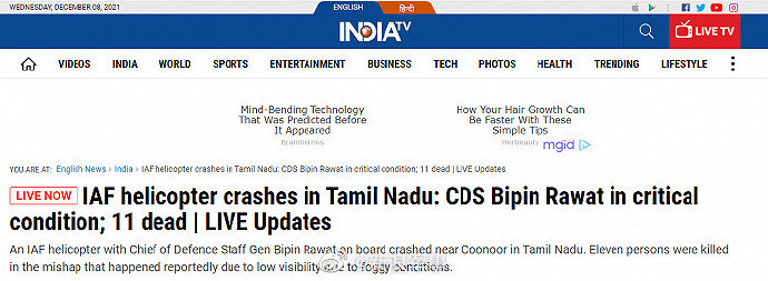 據印度電視台(INDIATV)報道,印度空軍直升機失事後,印度國防參謀長拉瓦特已被送往醫院,目前情況危急,事故死亡人數升至11人。報道稱,事故發生是由於大霧天氣導致能見度低。