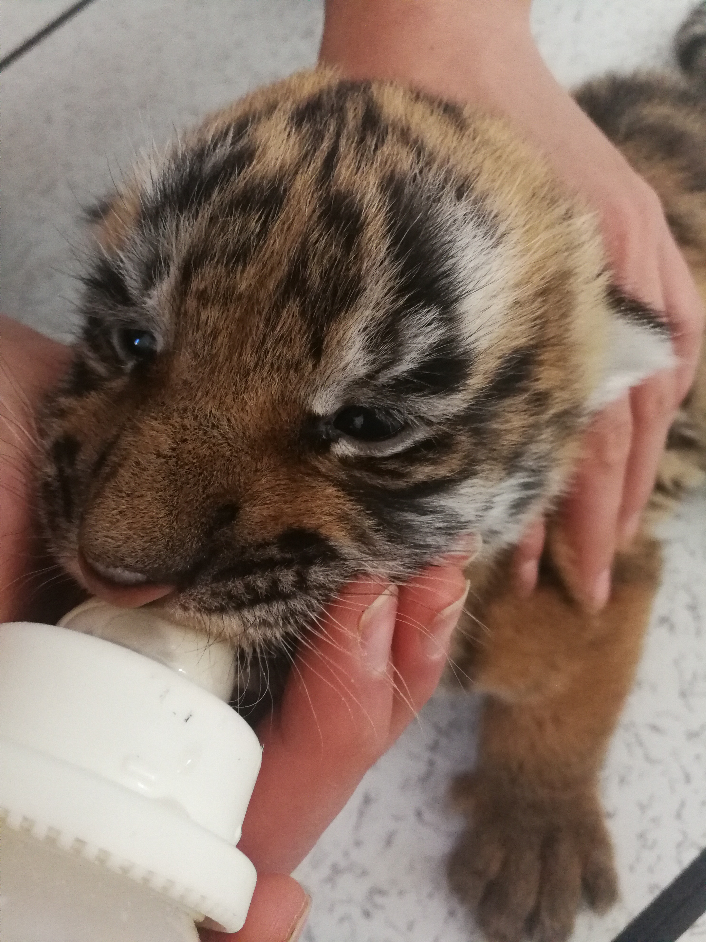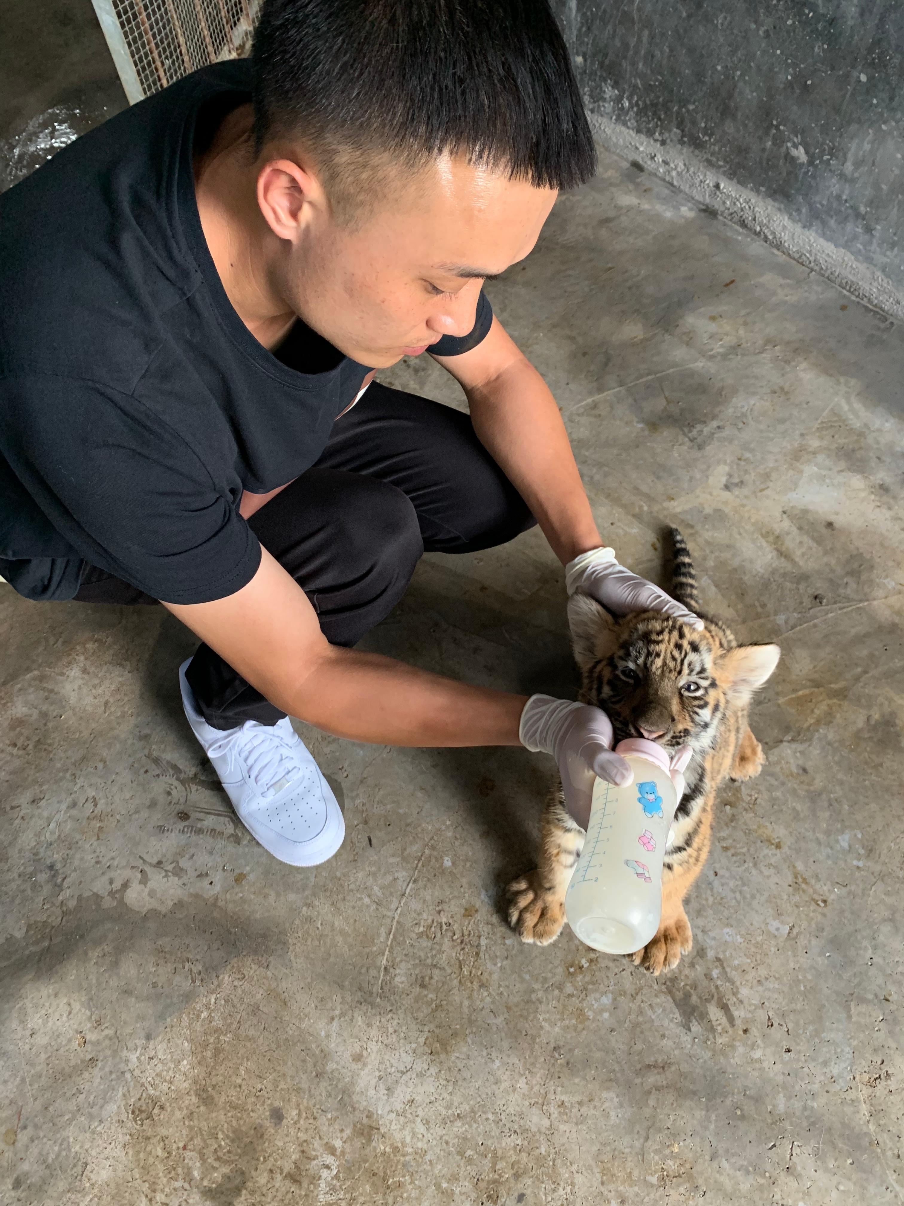 因為是第一次當媽媽,沒經驗,所以我和2個兄弟都由「奶爸」帶大。虎研所研發了一款適宜我們老虎的奶粉。在我還不會用奶瓶吃奶的時候,「奶爸」用去了針頭的針筒往我嘴裏灌奶。雖然得到近一個禮拜才能睜開眼,但溫溫的奶水,口感還不錯。