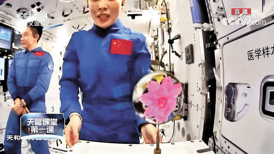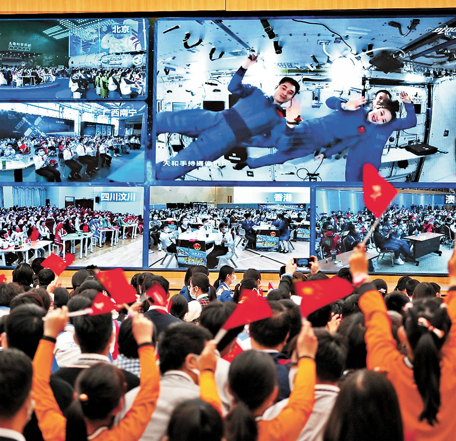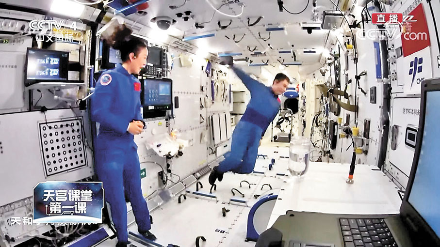 (香港文匯報記者 姬文風)中國空間站首次太空授課活動—「天宮課堂」昨日下午取得圓滿成功。由「神舟十三號」飛行乘組航天員翟志剛、王亞平、葉光富擔任「太空教師」,通過視頻通話形式與地面課堂師生進行了實時互動交流。在約60分鐘的授課之中,「航天三傑」先後展示了空間站工作生活場景和研究項目,向同學演示了太空轉身、浮力消失、水球光學等多項實驗,並即席解答同學們的不同提問。