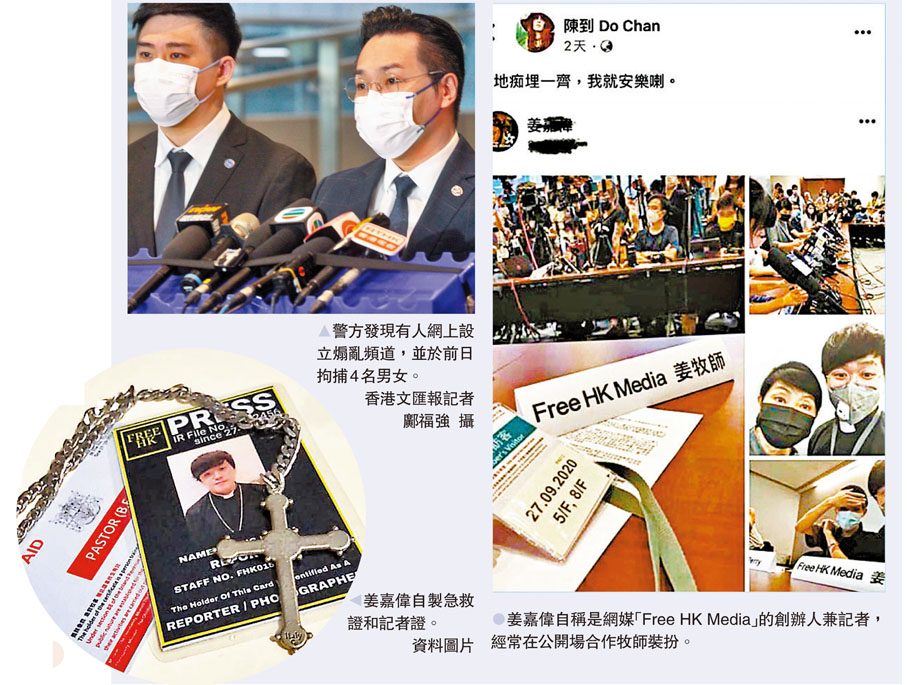 (香港文匯報記者 蕭景源)香港的攬炒派餘孽亂港之心不死,警方近日再發現有人上月在Telegram設立煽亂頻道,煽惑群眾反對特區政府推行加強版「安心出行」政策,又鼓動市民拒打疫苗、及以不同手段「杯葛」12月19日的立法會換屆選舉,甚至煽動市民於11月20日及昨日政府規定市民進入食肆等須使用「安心出行」的日子,參與非法集會和舉行所謂「三罷」,及使用暴力搞破壞。警方經深入調查,於前日拘捕4名男女,包括經常自稱為「急救員」、活躍黑暴前線的撐暴假牧師姜嘉偉。