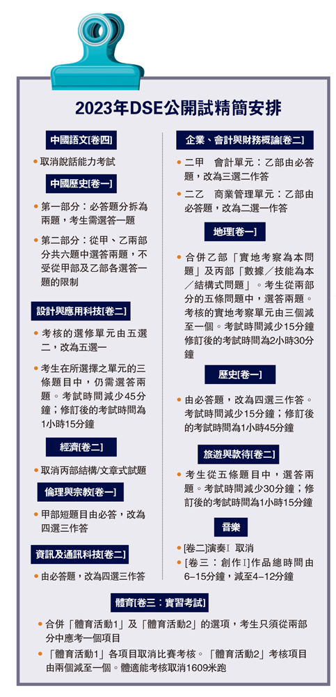 考評局表示,2023年文憑試的整體安排與2022年相同,精簡公開考試及校本評核的要求,是為讓師生在學與教方面更具彈性。除數學科不作任何改動外,其他23個科目的《評核大綱》會因應上述精簡安排而作出修訂,相關科目各卷別/部分的佔分比例亦會作出調整,詳情請參閱學校通告及各科經修訂的《評核大綱》。
