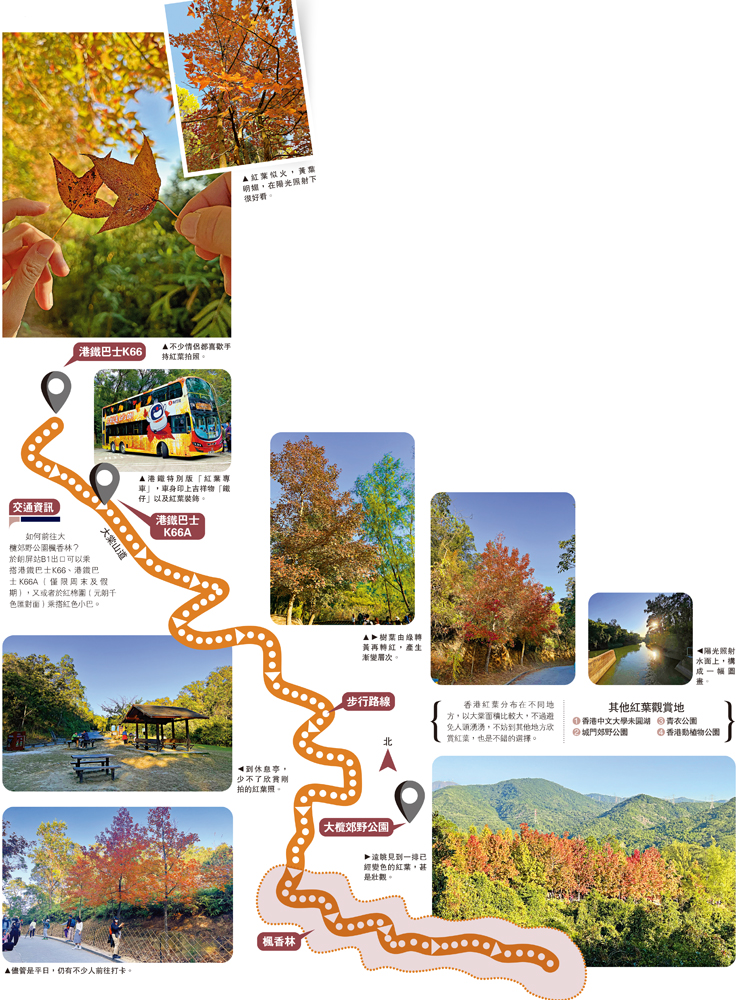 每年12月的時候,不少情侶、一家大細都會前往元朗大棠欣賞紅葉,每逢周末人頭湧湧。上星期,記者選擇了平日前往大棠,仍見不少人到此打卡,既有行山人士,又有單車愛好者,亦有「多代同堂」一起前往。要前往大棠的方法甚多,可以先抵達港鐵朗屏站,再轉乘港鐵巴士K66特別班、九巴68R紅葉專車,又或者搭小巴,均可以到達山腳,交通相對方便。