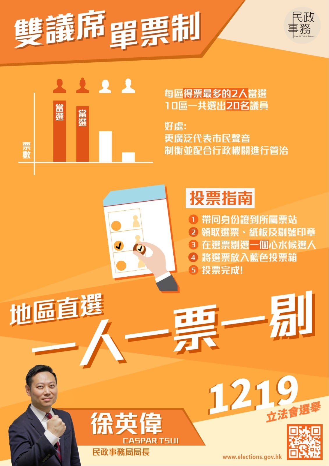 徐英偉上載的單張,乍看之下與眾多候選人的宣傳品十分相似,但內容就變成「請支持1219立法會選舉」、「為港為己投一票」。他又附上疑似「政綱」要點:民政精神、以民為本、行多步做多啲;單張另一頁則有雙議席單票制的簡介及投票指南。此外,兩頁均有二維碼鏈接到選舉網站,為選民提供更多選舉相關資料。