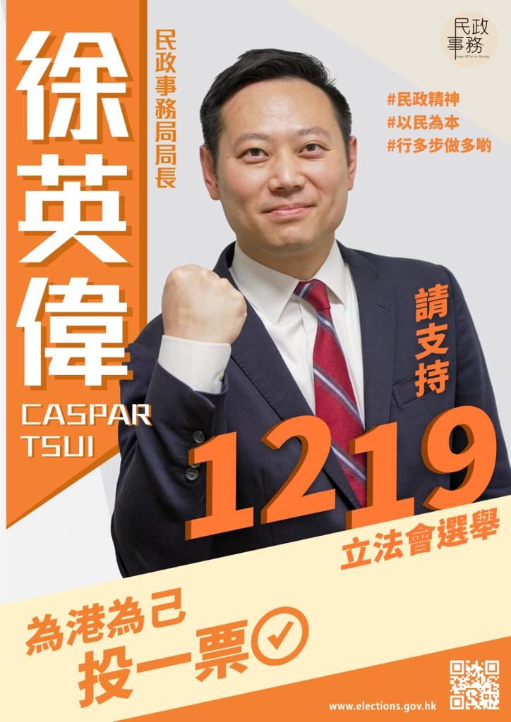 大公文匯全媒體報道,完善選舉制度後的首場立法會換屆選舉將於下周日(19日)舉行,多名司局長今日(12日)都在網上呼籲市民踴躍投票。而民政事務局局長徐英偉更別出心裁,在社交平台發帖,放上以自己為主角的「候選人」單張,提醒市民記得投票。