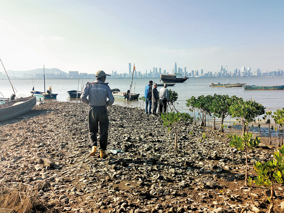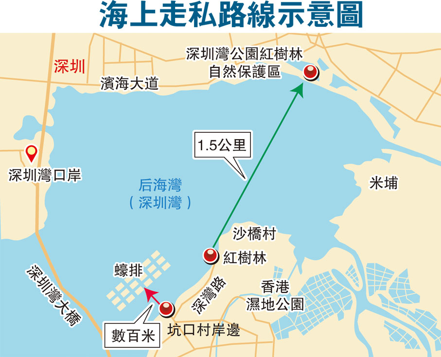 香港文匯報記者日前在流浮山深灣路一帶觀察,在位於沙橋村一個紅樹林中,發現疑似走私的小艇。記者再到坑口村岸邊觀察,此處與深圳南山區(包括蛇口)只是一水之隔,最近的距離只有1公里左右,在離岸數百米外的海面上,一望無際的蠔排整齊漂浮。村民說,一些蠔排上的簡陋小屋就被人用作「走私中轉站」。