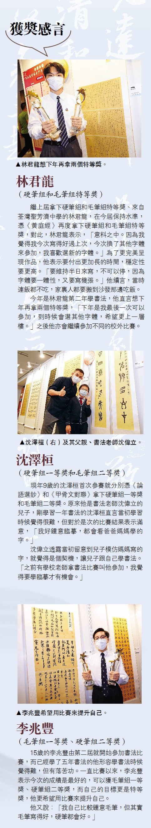 其中以《建黨100周年詩詞》榮獲硬筆組二等獎的李錕發,他認為這篇由老師給他選的文章有代表性,自己亦在撰寫時候有所感悟:「中國共產黨的成立並不容易。」另外李錕發的孖生哥哥李鎮發也有參加比賽,亦獲得佳績,兩兄弟早前看到別人寫書法,因而產生興趣學習,平日更會一起練字。