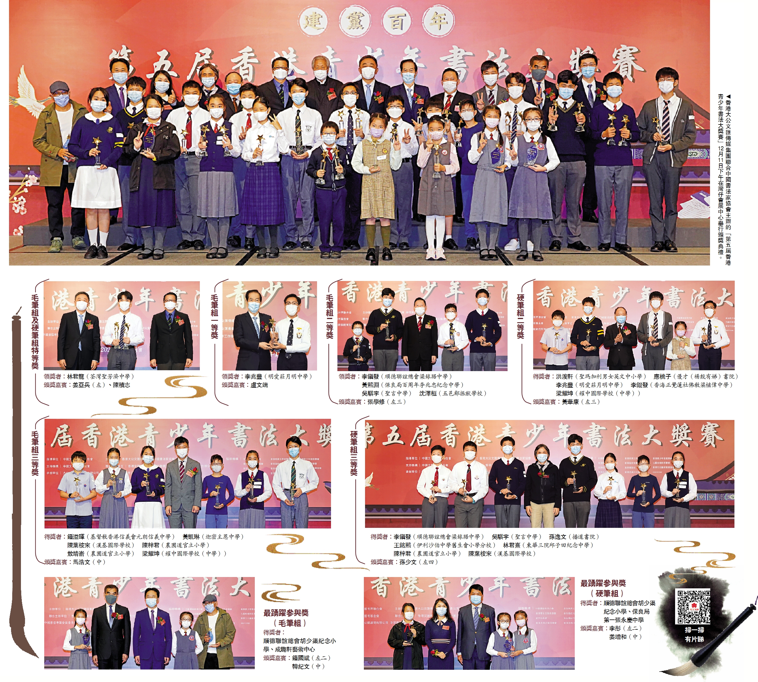 (大公報記者 李亞清 許詠妍 湯艾加、梁堅)由香港大公文匯傳媒集團、中國書法家協會聯合主辦的「第五屆香港青少年書法大獎賽」12月11日在灣仔會展中心舉行頒獎典禮。本屆比賽共收到全港190所中小學毛筆、硬筆書法作品逾2000件,共評出毛筆組及硬筆組特等獎,一二三等獎及優異獎,最踴躍參與學校、機構獎等共逾140個獎項。