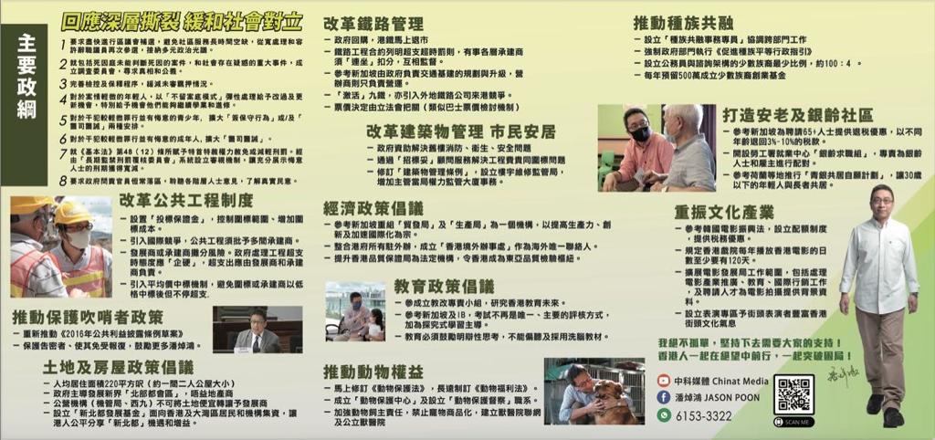大公文匯全媒體報道,立法會換屆選舉將於周日(12月19日)舉行,共153名候選人90個議席,全部90席都出現激烈競爭,充分反映今場選舉的多元性及公平公正原則。其中,一般市民最為關心的界別,當屬選民人數最多的地區直選。10個地方選區,每區都有3到5人參選,即無人會自動當選。市民最關心的就是候選人的政綱或參政理念,以及候選人過往的工作表現。大公文匯全媒體為讀者整理了地區直選候選人的政綱理念,以方便選民了解每名候選人的政綱,令市民投票前可以掌握更多資訊,投票選出賢能治港者。