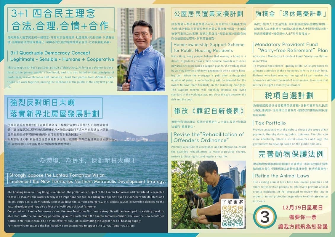 大公文匯全媒體報道,立法會換屆選舉將於周日(12月19日)舉行,153名候選人競逐90個議席,全部90席都出現激烈競爭,充分反映今場選舉的多元性及公平公正原則。其中,一般市民最為關心的界別,當屬選民人數最多的地區直選。10個地方選區,每區都有3到5人參選,即無人會自動當選。市民最關心的就是候選人的政綱或參政理念,以及候選人過往的工作表現。點新聞為讀者整理了地區直選候選人的政綱理念,以方便選民了解每名候選人的政綱,令市民投票前可以掌握更多資訊,投票選出賢能治港者。
