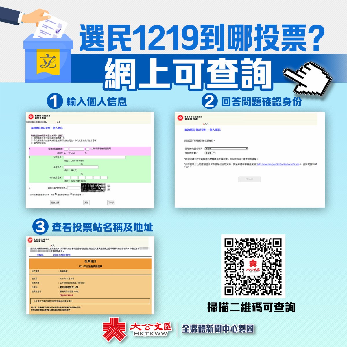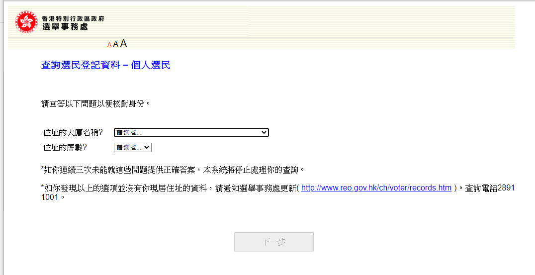 選民點擊「下一步」後,需要回答問題以便核對選民身份,問題包括住址的大廈名稱及住址的層數,選民從下拉菜單中選擇正確的住址大廈名稱及層數後,點擊「下一步」就可以查詢到自己的投票站了。