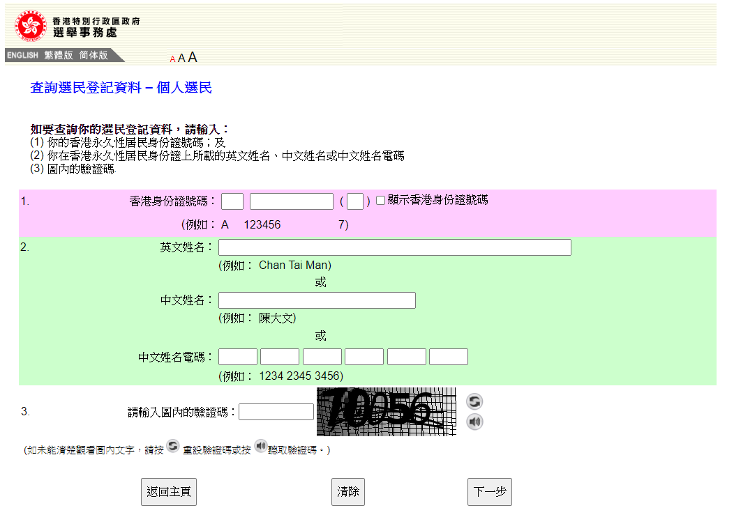 選民在登入網址後,需要輸入香港身份證號碼,英文姓名、中文姓名或中文姓名電碼可以任選一項輸入,同時輸入驗證碼,之後點擊「下一步」。