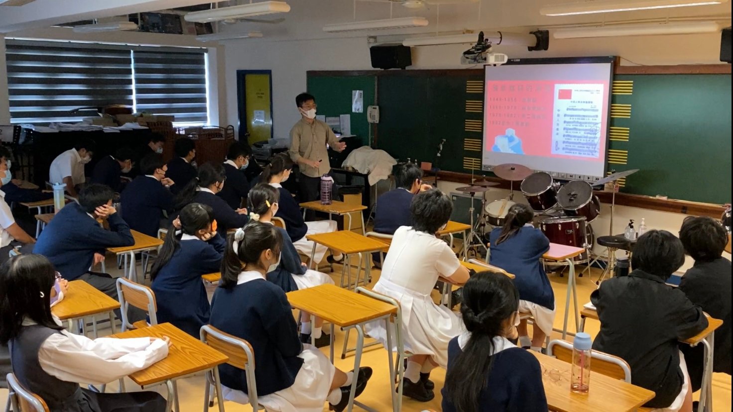 音樂堂由熱身環節開始,音樂科老師林敏熙先以圖片提示,引導同學思考並回答有關國歌的基本問題。例如「四隻耳朵」猜一國歌作曲者,答案呼之欲出。